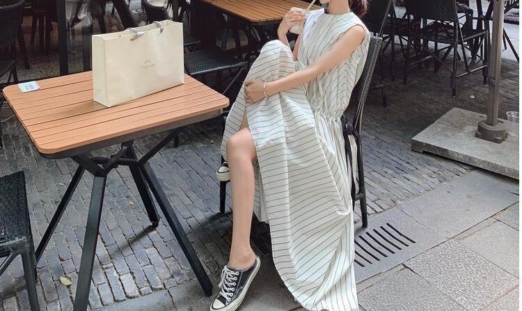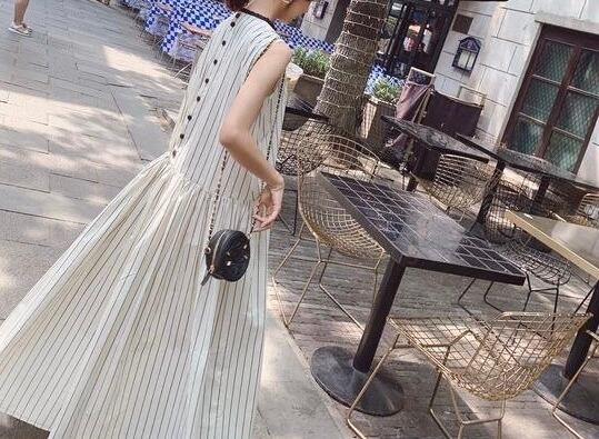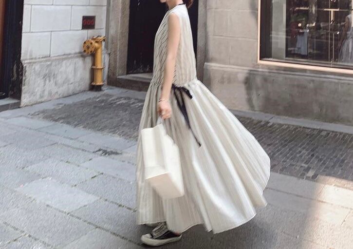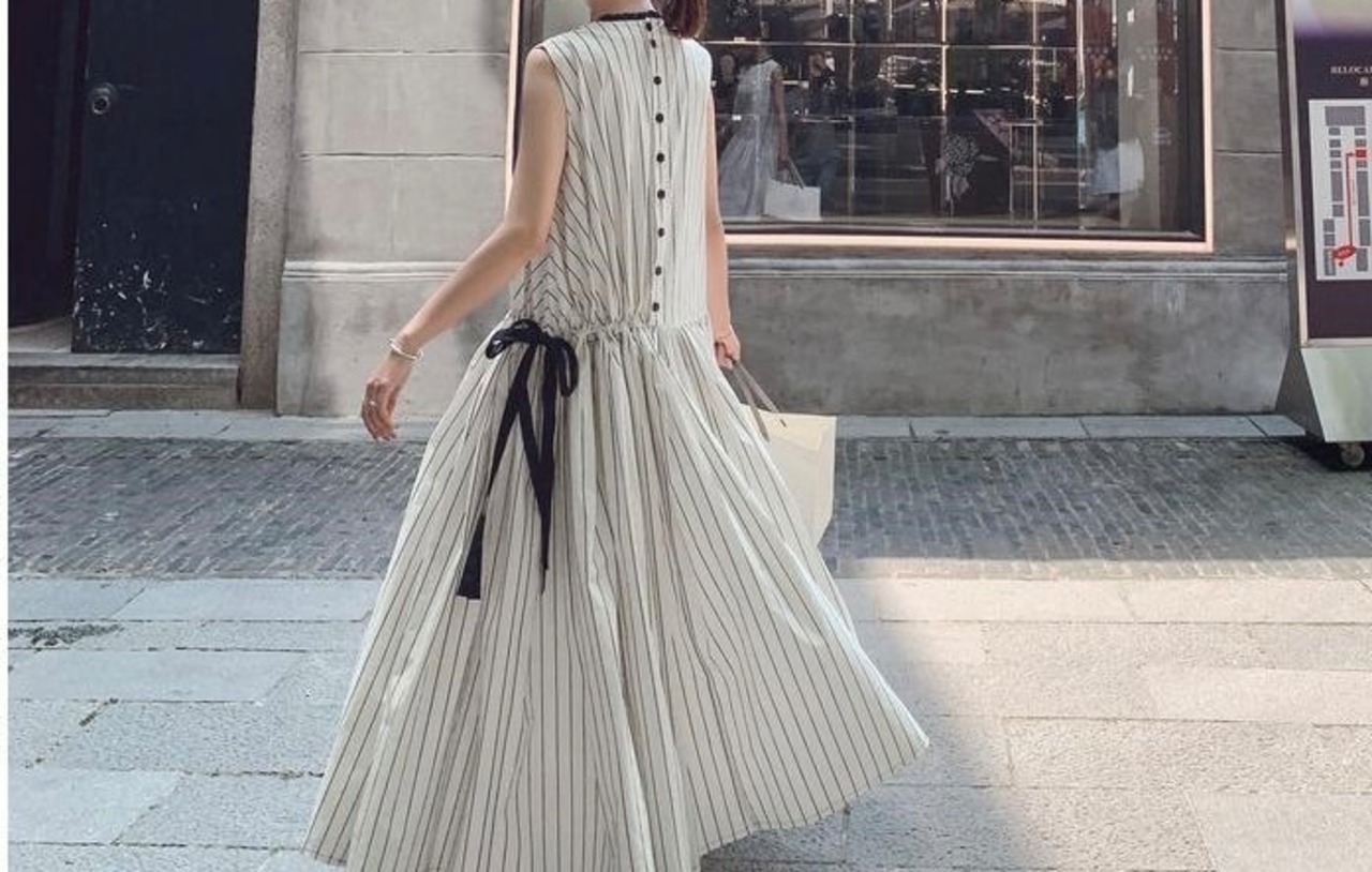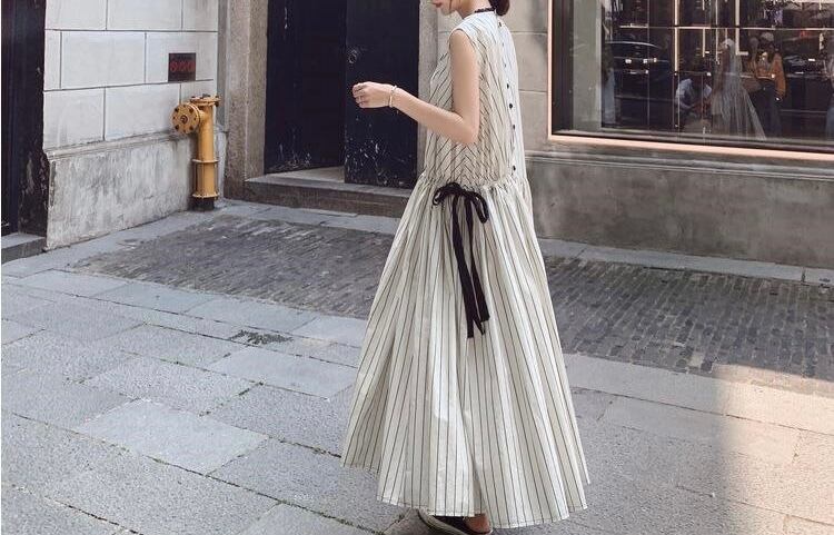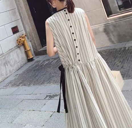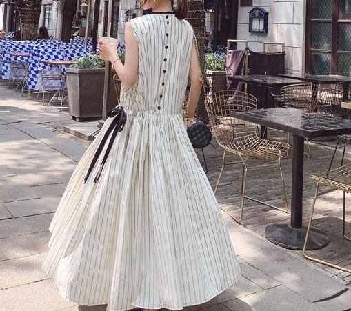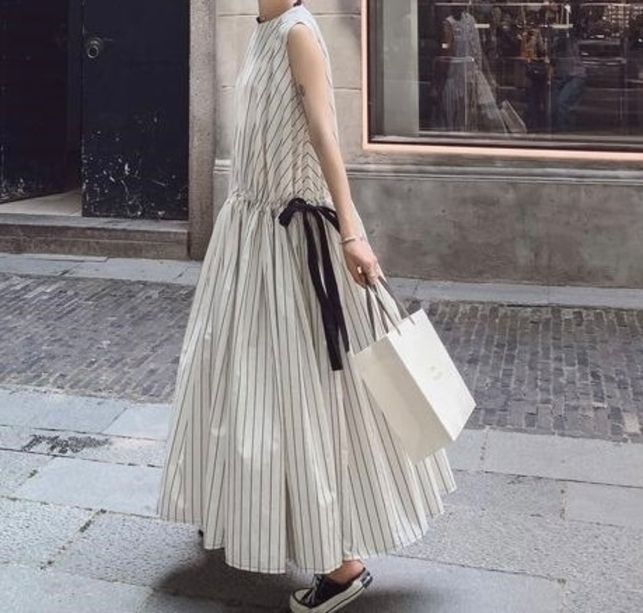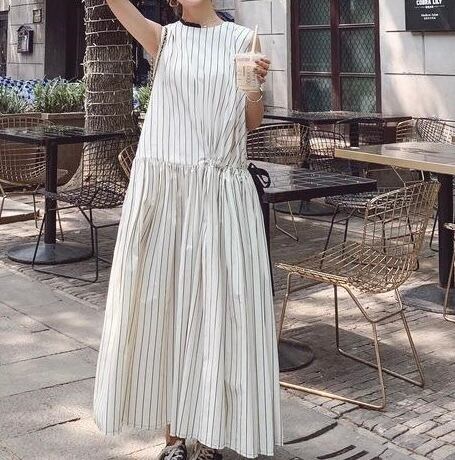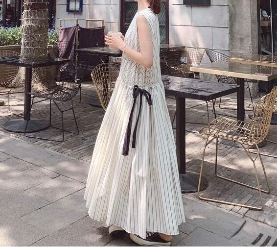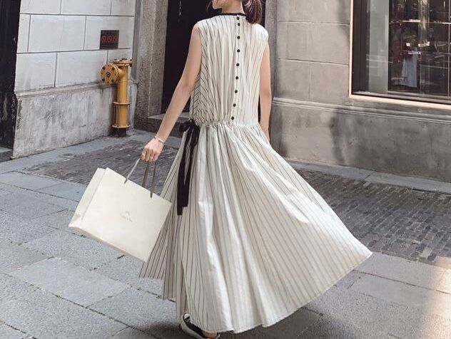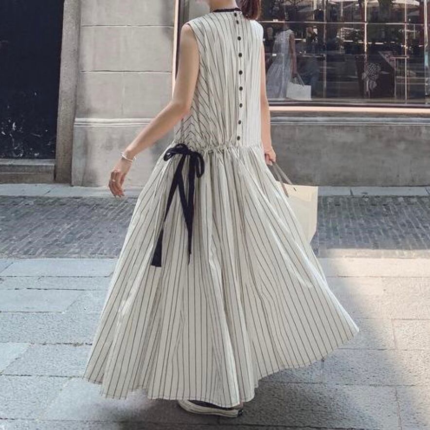 ワンピース ストライプ ロング丈 マキシ丈 ノースリーブ 袖なし サイドリボン ウエストマーク ハイウエスト 脚長効果 スタイルアップ フレア スカート ホワイト白 ボタン バックスタイル S M L XL 大きいサイズ 高身長 夏 サマー 海 プール ビーチ リゾート お出かけ 旅行 デート ランチ 散歩 買い物 ワンピ ゆったり モノクロ ツートン 通勤 アラサー 20代 30代 40代 アラフォー レディース 女子会 大人 カジュアル オシャレ お洒落 おしゃれ ラフ 楽かわ ママコーデ