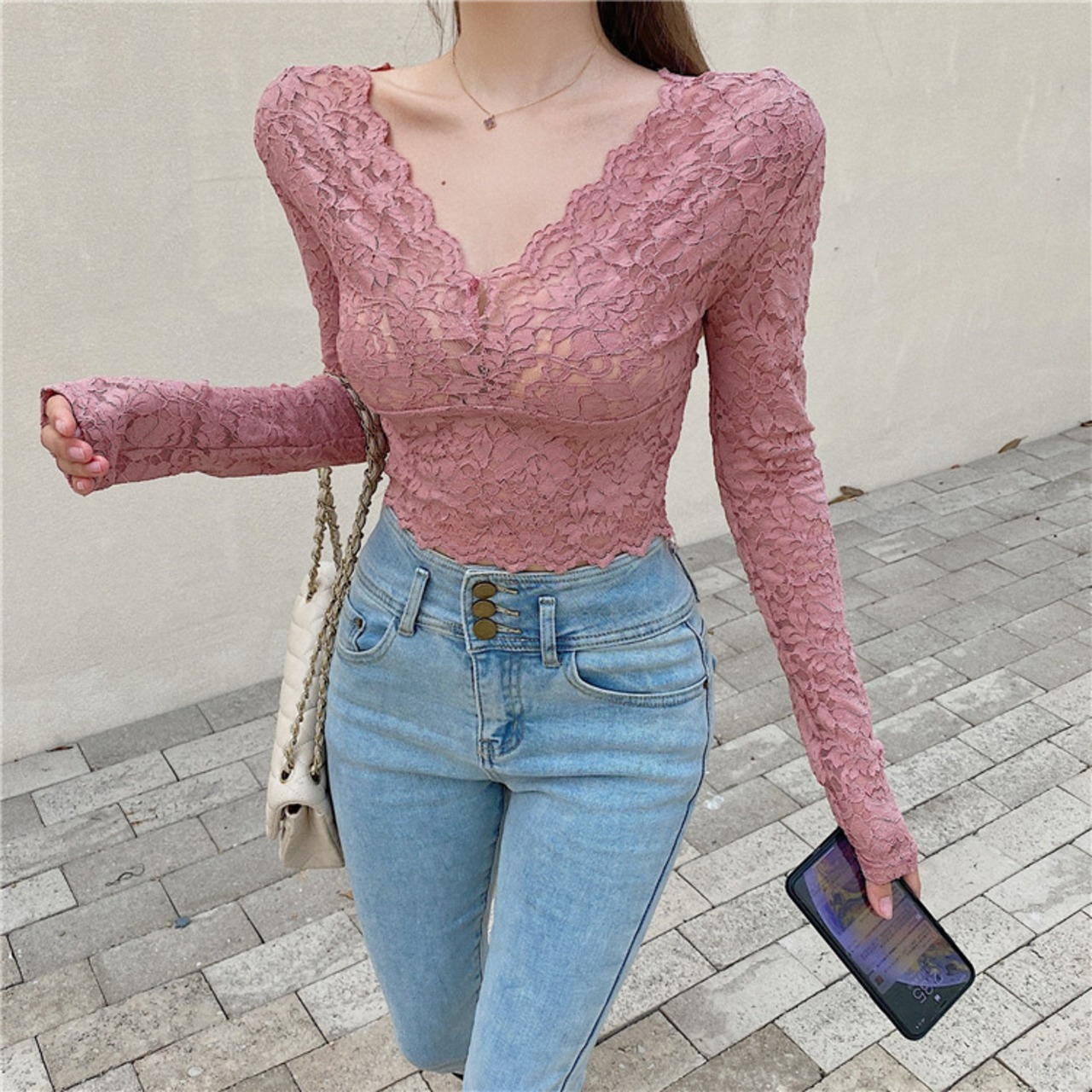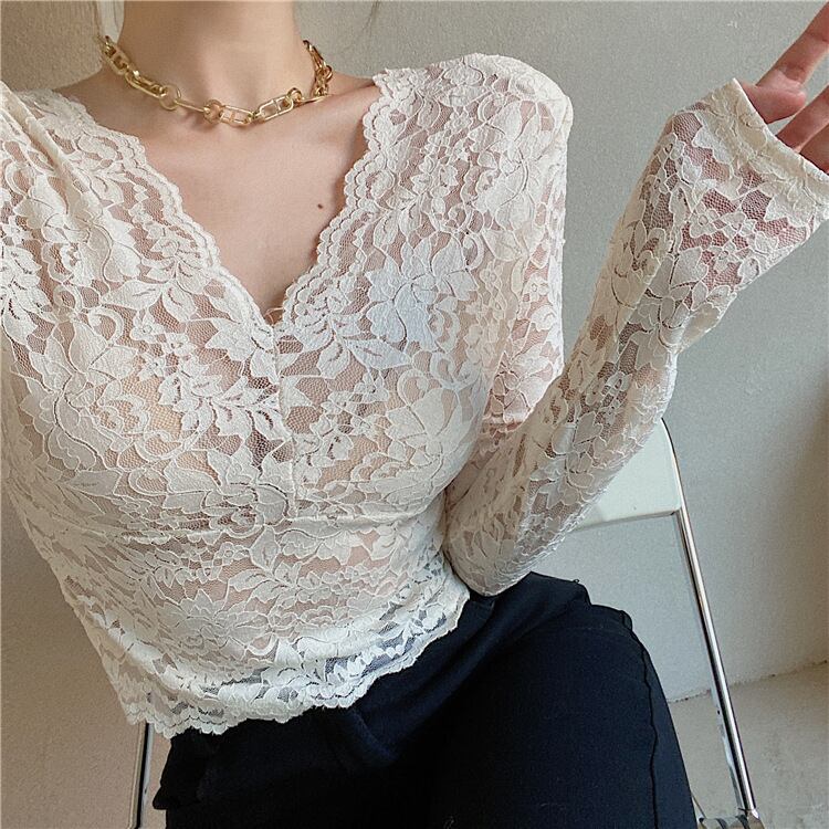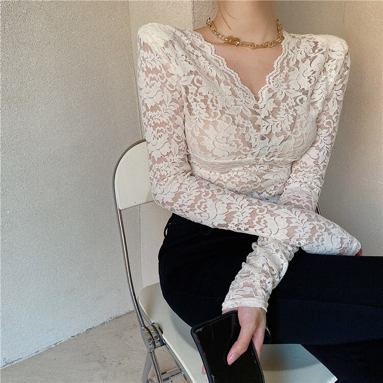 総レースデザインで華やかな印象を与えてくれるVネックトップス。