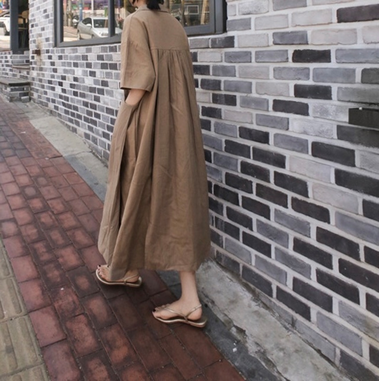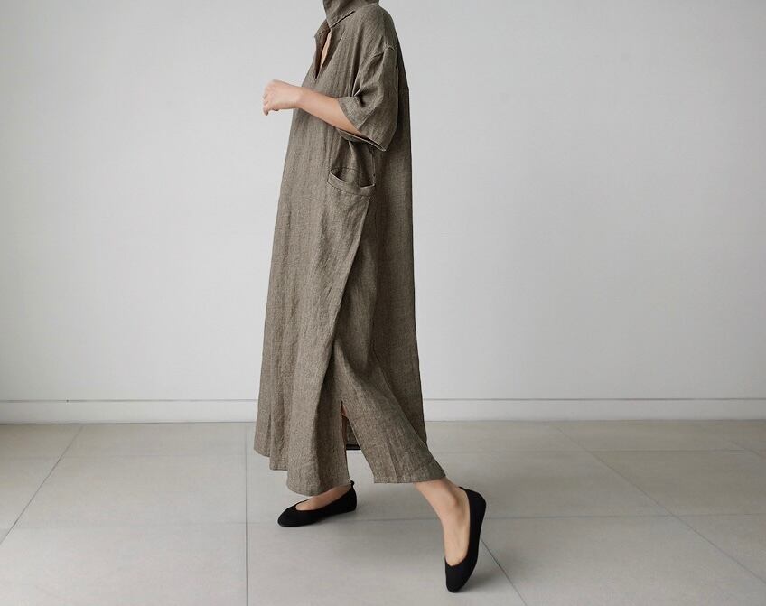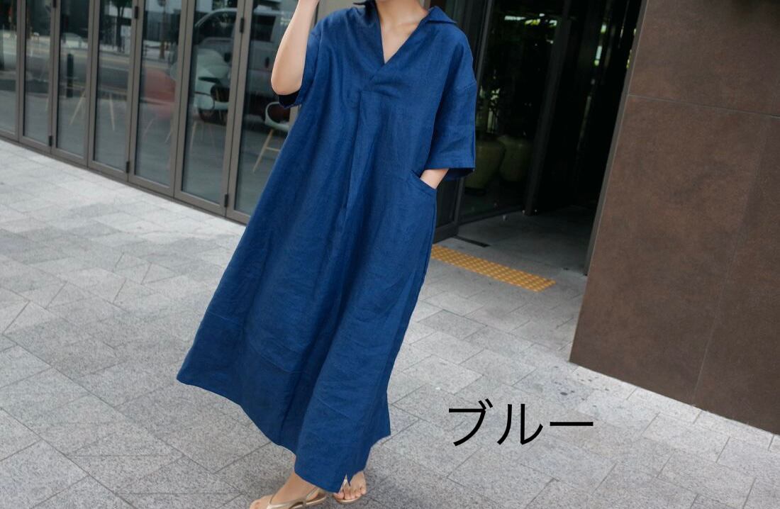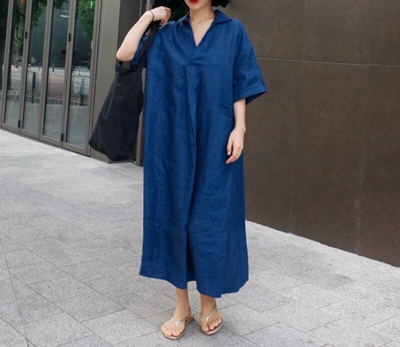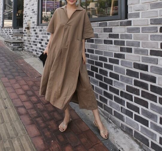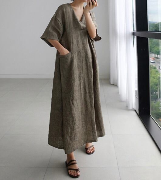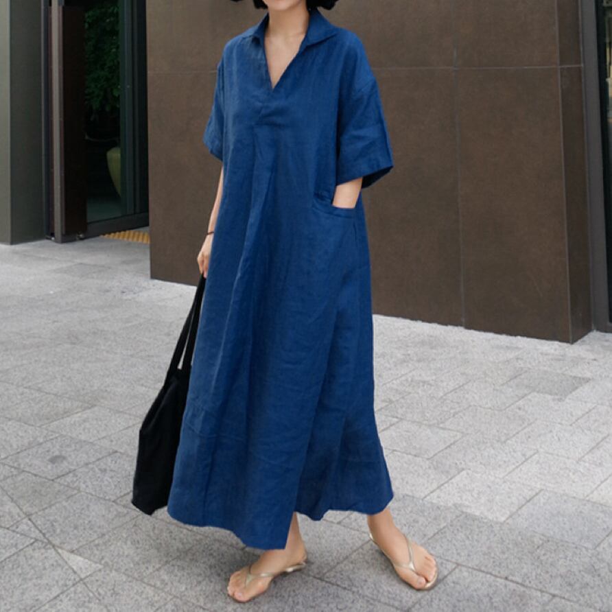 ワンピース ロング丈 膝下 袖あり 五分丈袖 バッグスリット Vネック サイドポケット ゆったり ビッグシルエット オーバーサイズ 襟付き 無地 ワンカラー ベージュ ブラウン カーキ ブルー 青 茶色 ナチュラル 大人 シンプル オシャレ お洒落 おしゃれ 20代 30代 40代 50代 アラサー アラフォー アラフィフ 散歩 ランチ 通勤 お出かけ ヘビロテ 普段使い 旅行 観光 半袖