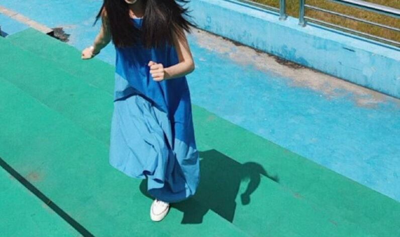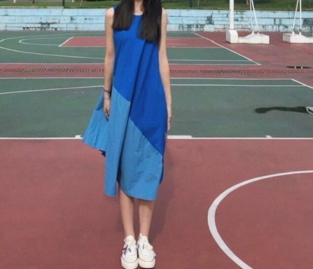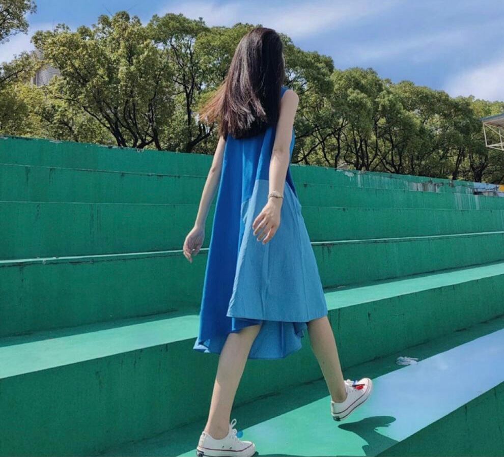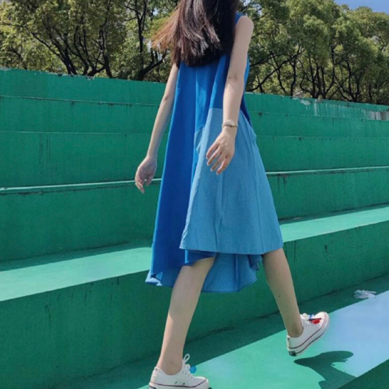 ワンピース ブルー ツートン バイカラー 水色 青 無地 アシンメトリー ノースリーブ 袖なし ミディアム丈 ゆったり クルーネック 切り替え ストリート カジュアル シンプル スポーティー 大人 レディース 中学生 高校生 20代 10代 S M L XL 大きいサイズ 個性的 お出かけ 海 ショッピング 買い物 普段使い 通勤 ビーチ プール リゾート 旅行 観光 夏 サマー 涼しげ 爽やか
