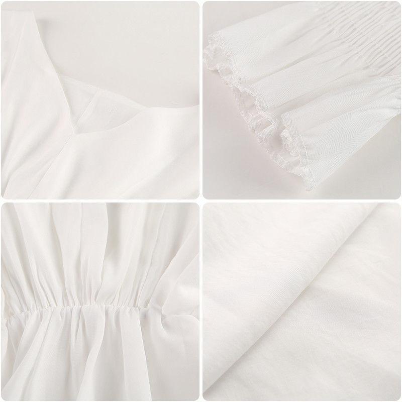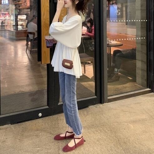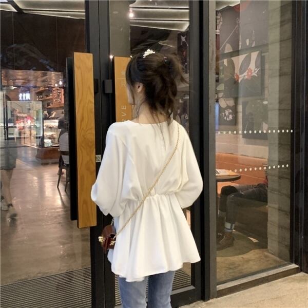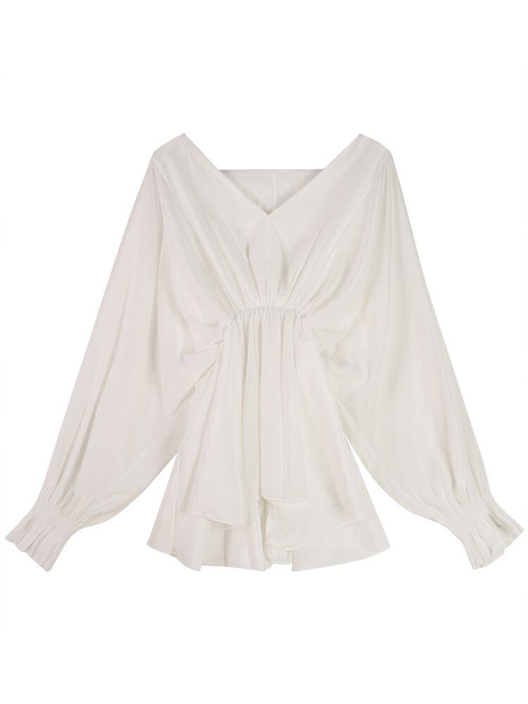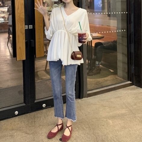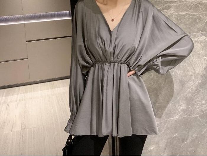 女性らしい柔らかい印象のVネックがデコルテをキレイに魅せてくれるブラウス。