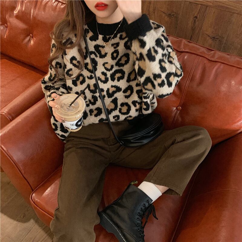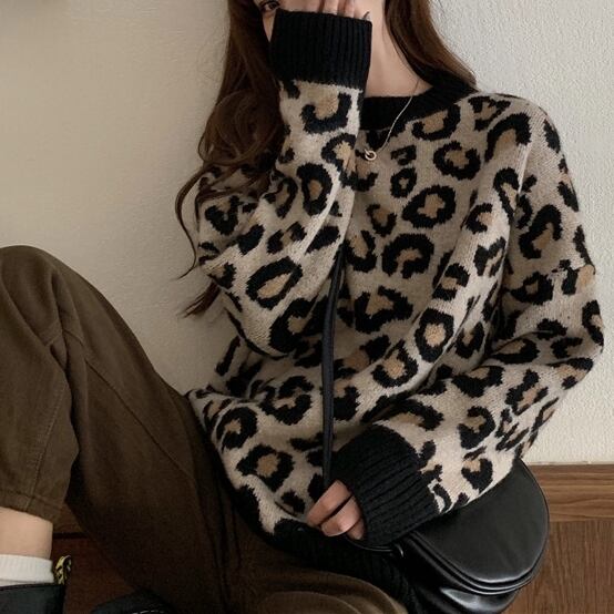 トップス レオパード柄 ニット セーター 長袖 ラウンドネック ヒョウ柄 豹 バイカラー あたたか ゆったり レトロ ルーズ 人気 個性的 おしゃれ お洒落 送料無料 プチプラ 可愛い かわいい 韓国 かっこいい カジュアル 大人 上品 きれいめ おしゃれ 大人可愛い 大人女子 モード系 ガーリー デイリー アニマル柄 総柄 デート お出かけ 女子会 レディース 女性用 10代 20代 30代 ママ 着回し 普段使い 重ね着 オルチャン ファッション 楽ちん モテ ブラウン 茶 グレー 灰色