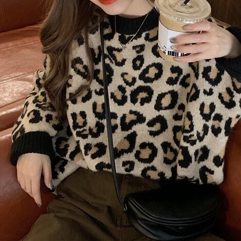 個性的なレオパード柄がコーデの主役になる長袖ニットセーターです。