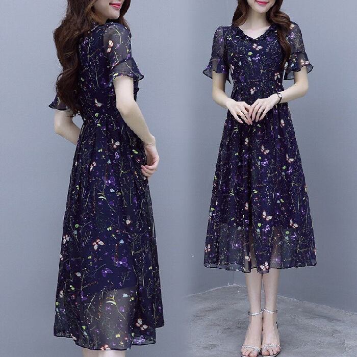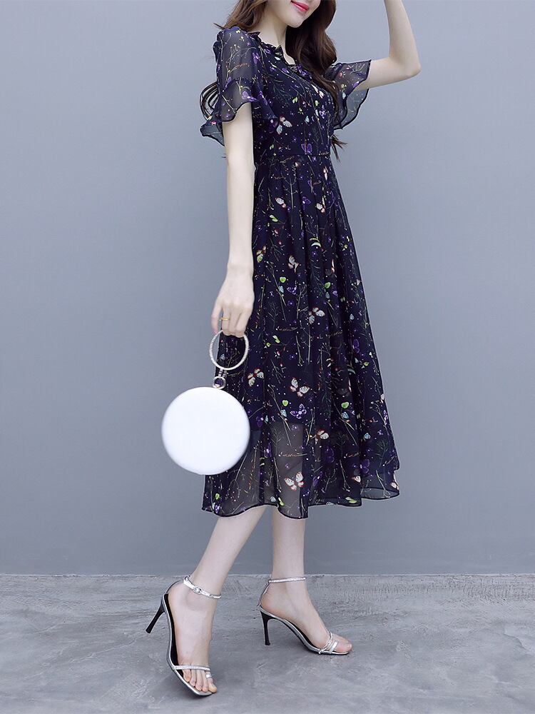 ワンピース 上着 人気 おすすめ おしゃれ お洒落 激安 安い 送料無料 プチプラ シースルー 半袖 ロングスカート Vネック 柄 フリル ウエスト くびれ ボリューム プリント 透け 花柄 可愛い かわいい 韓国 きれいめ 大人 上品 春 スプリング サマー 夏 レディース 女性用 20代 30代 S M L XL 2XL 3XL 紺 ネイビー パープル 大人カラー デート フェミニン お出かけ パーティーバタフライ 蝶 フラワー