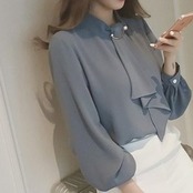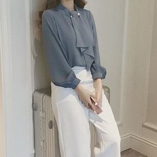 襟元のプリーツ仕立てのスカーフ型装飾が綺麗なブラウスです。