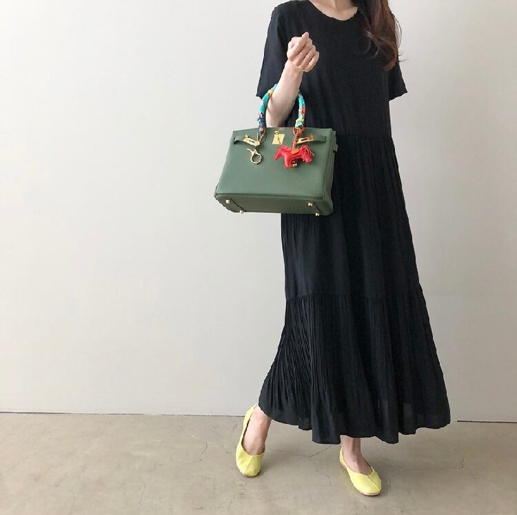 春や夏にオススメな落ち着いたデザインと色使いのロング丈ワンピース。