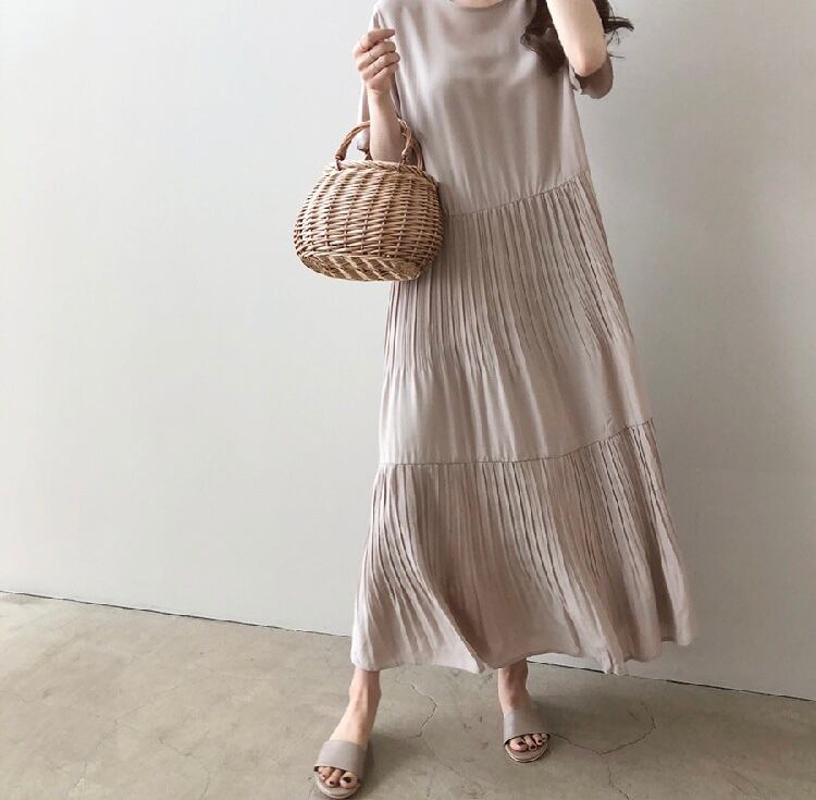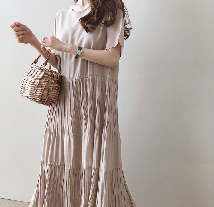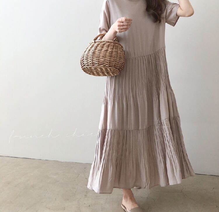 ワンピース ロング丈 マキシ 半袖 袖あり ワントーン プリーツ ゆったり 体型カバー 切り替え ウエストマーク ラウンドネック無地 春 夏 サマー スプリング シンプル きれいめ 綺麗系 大人 上品 カジュアル 全年代 ママコーデ 20代 30代 40代 50代 アラサー アラフォー アラフィフ 通勤 ランチ 買い物 ショッピング 旅行 観光 デート 散歩 海 ビーチ リゾートプール 大きいサイズ M L XL 2XL 送料込み 送料無料