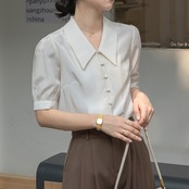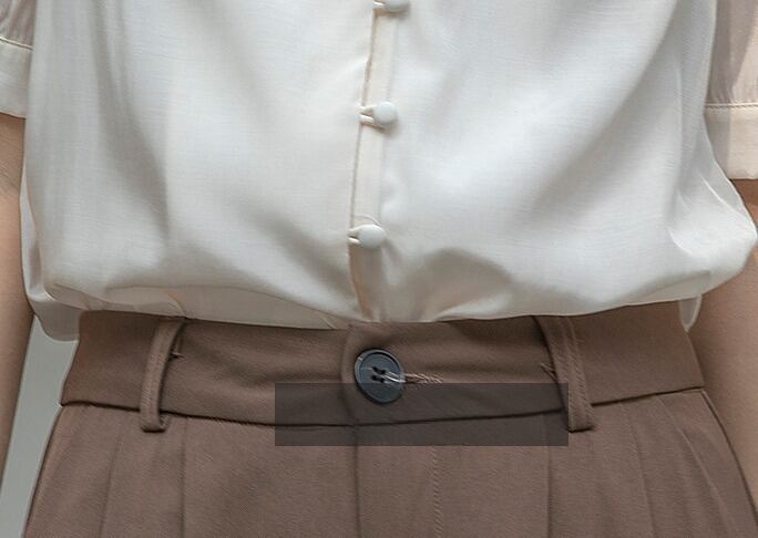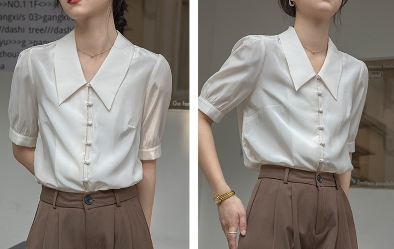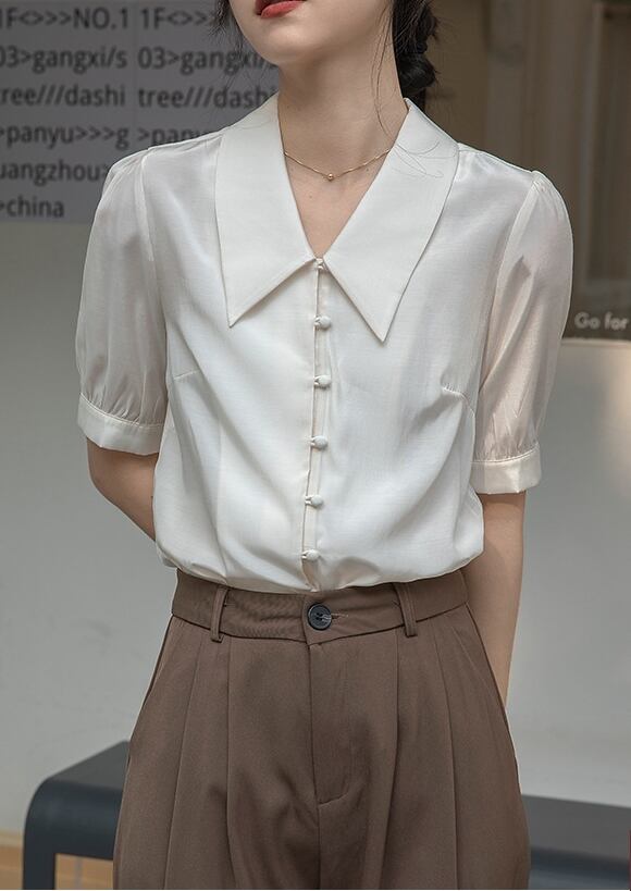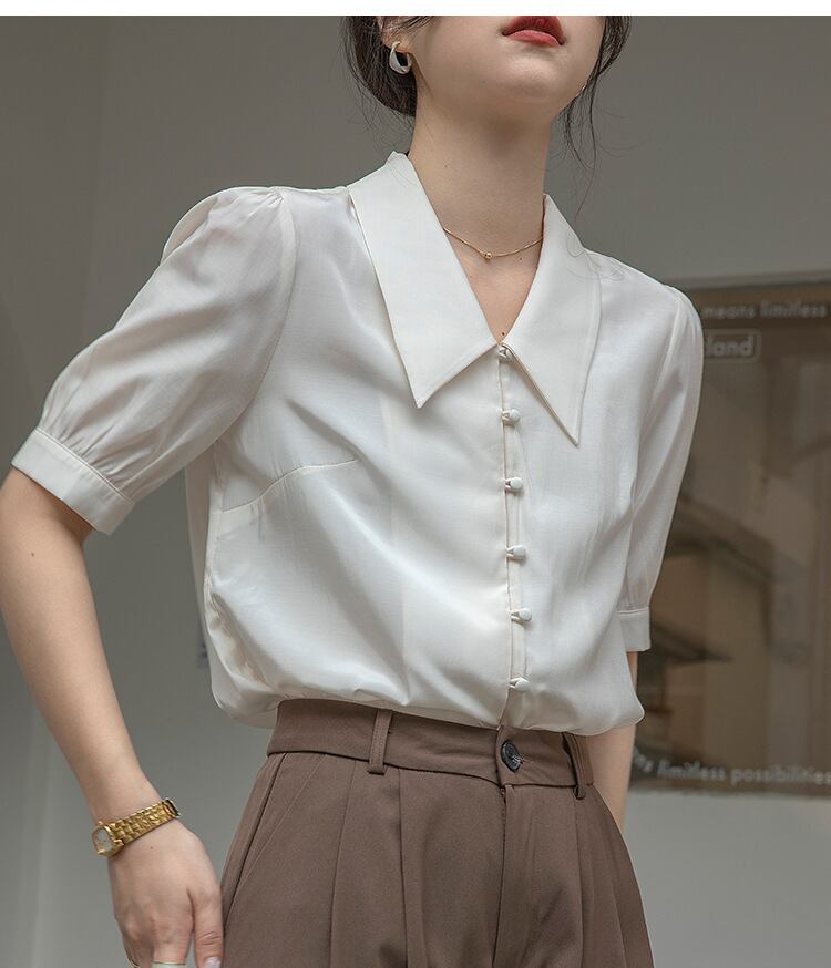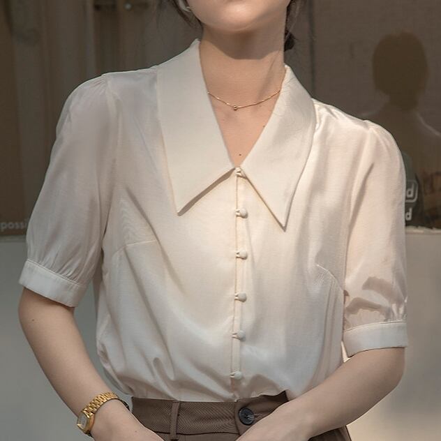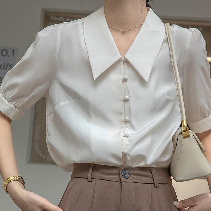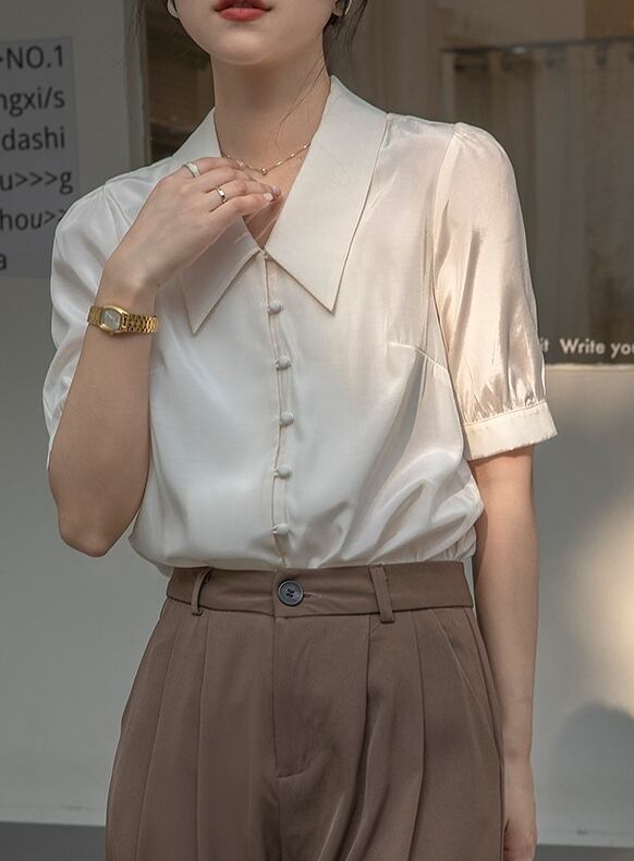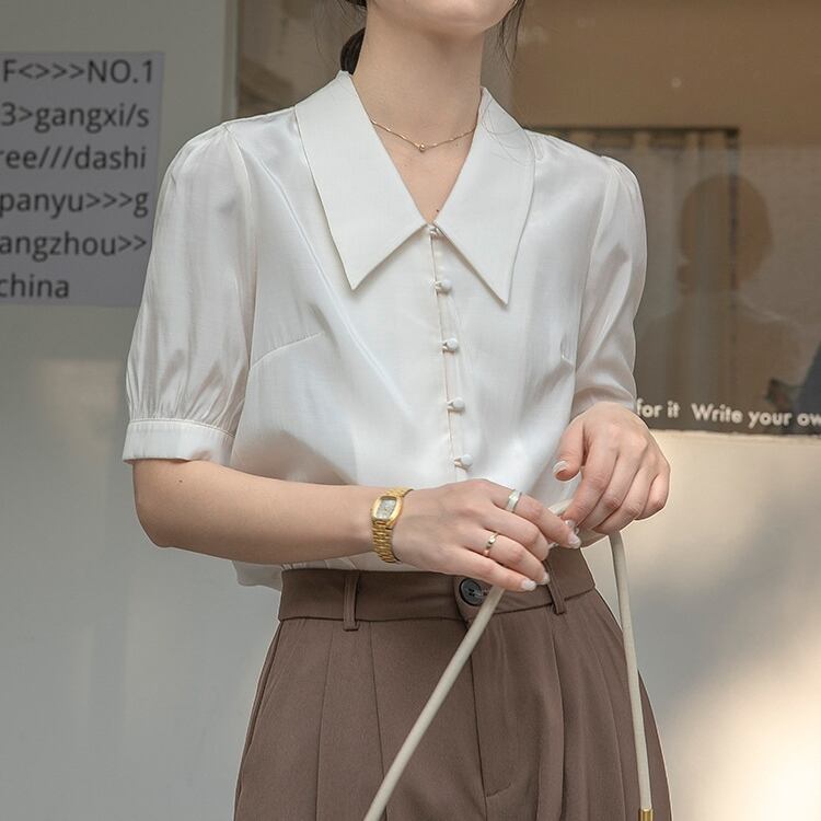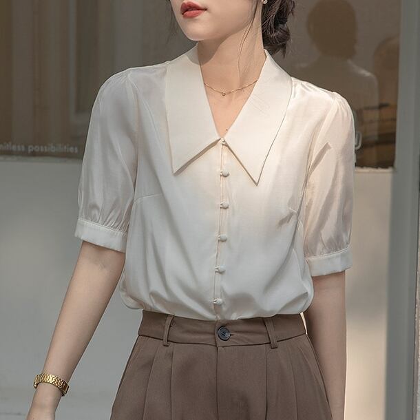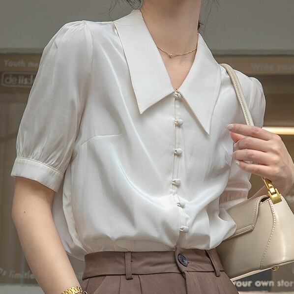 トップス ブラウス 袖あり 半袖 パフスリーブ シフォン サテン シルクタッチ クルミボタン かわいい 大人可愛い きれいめ シンプル カジュアル 上品 おしゃれ レトロ 大人女子 こなれ感 クール セクシー エレガント 抜け感 春 夏 10代 20代 30代 40代 レディース オフィス OL 通勤 学生 通学 デート お出かけ 女子会 休日 リゾート 旅行 着回し 普段使い 韓国系 オルチャン ファッション コーデ スタイル モテ 体型カバー S M L XL ホワイト ブルー