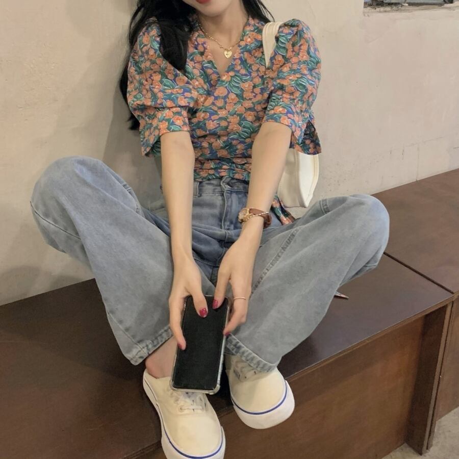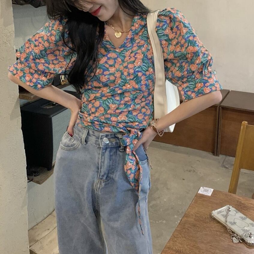 ヴィンテージライクなくすみカラーの花柄がお洒落なカシュクールブラウスです。