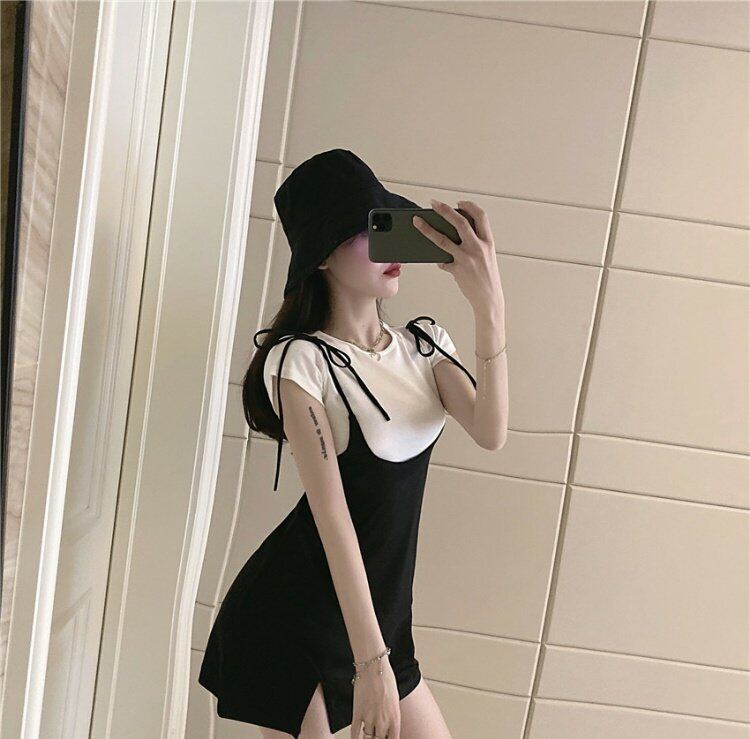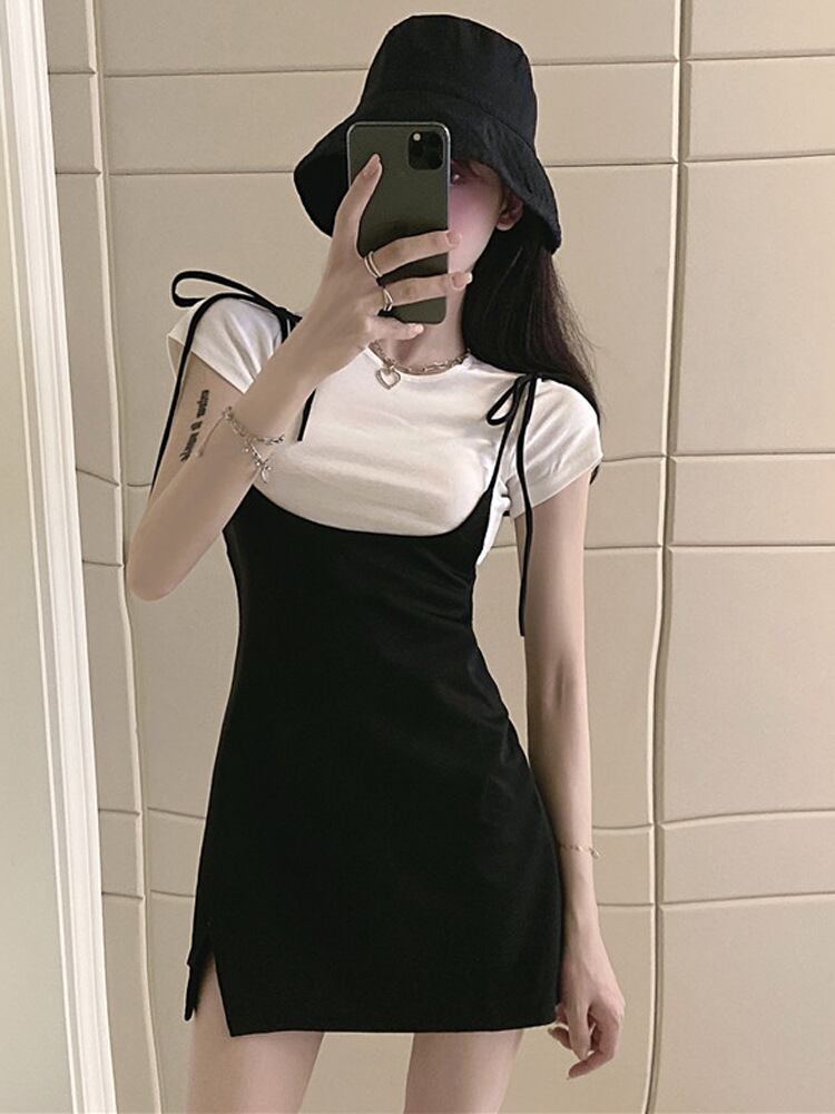 ワンピース 上着 人気 おすすめ おしゃれ お洒落 激安 安い 送料無料 プチプラ Tシャツ ティーシャツ 半袖 ミニスカート ウエスト ラウンドネック 丸首 無地 オリジナル 可愛い かわいい 韓国 シンプル カジュアル きれいめ 大人 上品 春 スプリング サマー 夏 レディース 女性用 20代 30代 S M L 白 ホワイト 黒 ブラック 大人カラー バイカラー デート フェミニン セットアップ セクシー カジュアル
