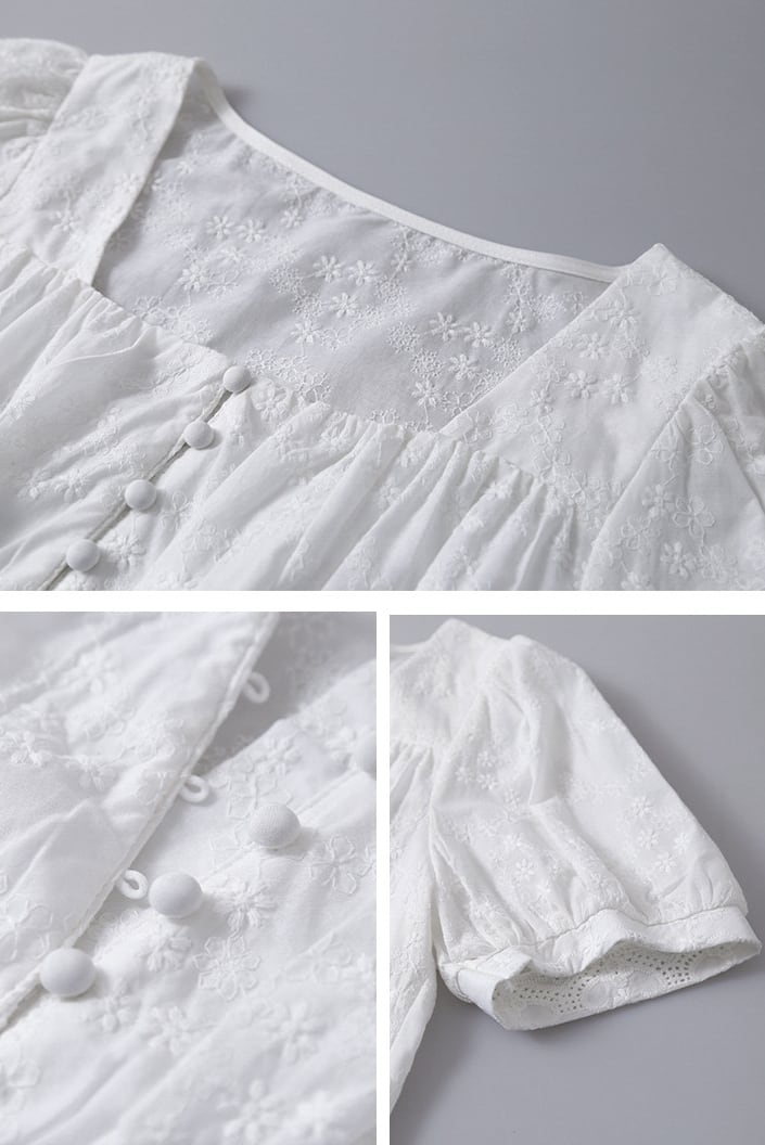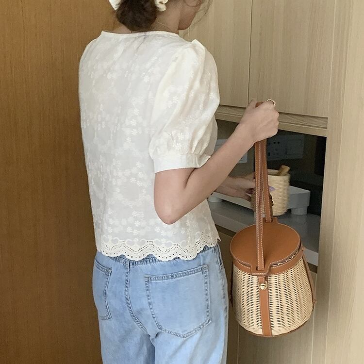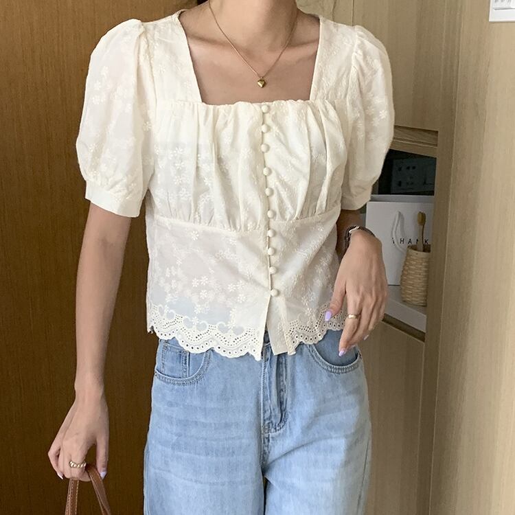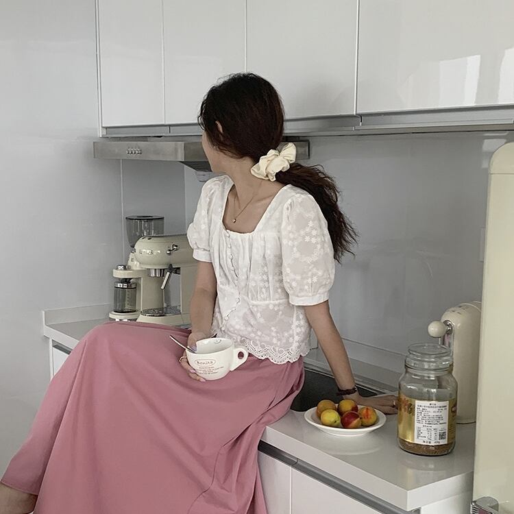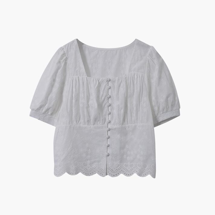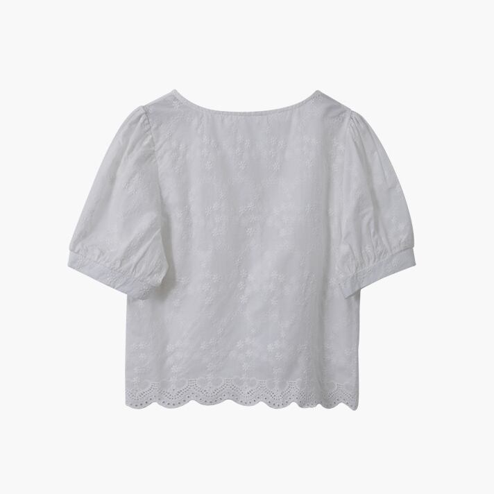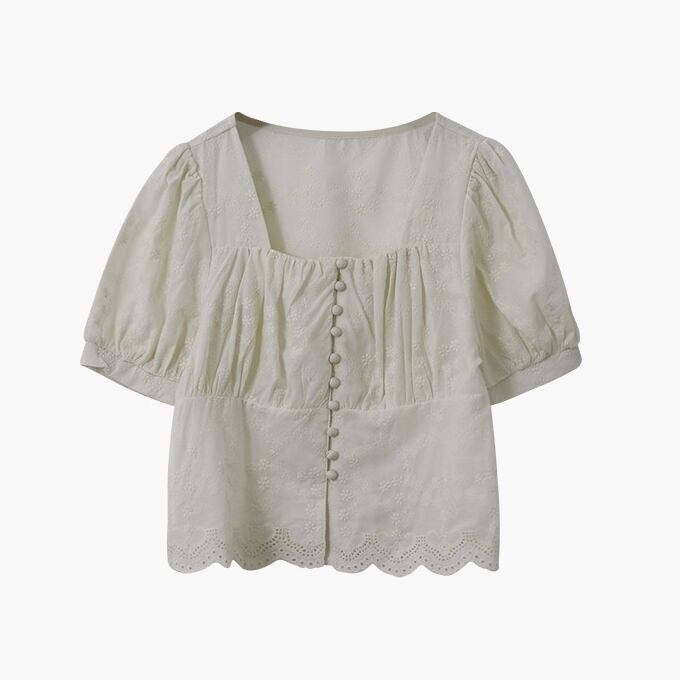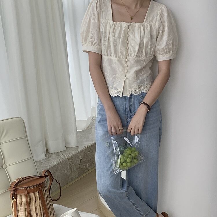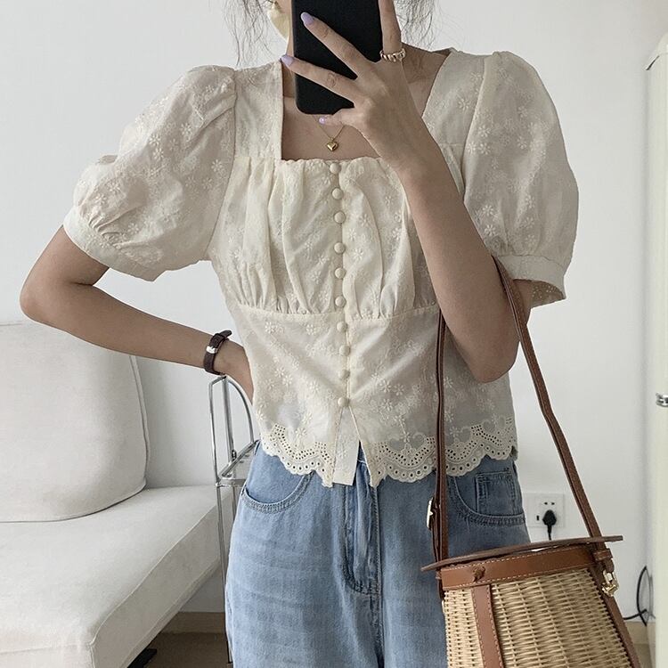 バストのふんわりボリューム感が可愛いレース仕立てのブラウスです。