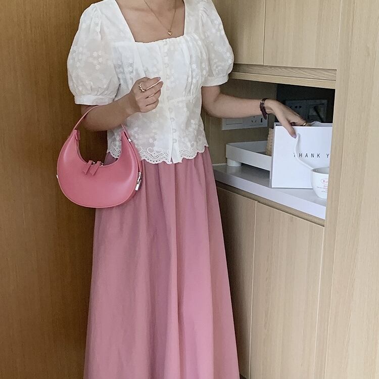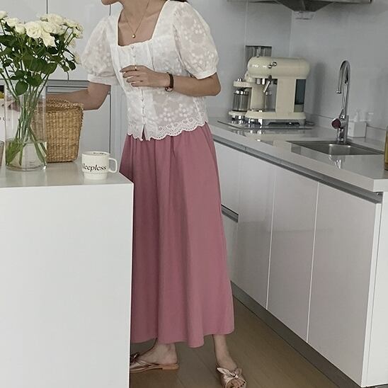 スクエアネックがデコルテを綺麗に見せて体型カバーにも優れた便利な一着です。