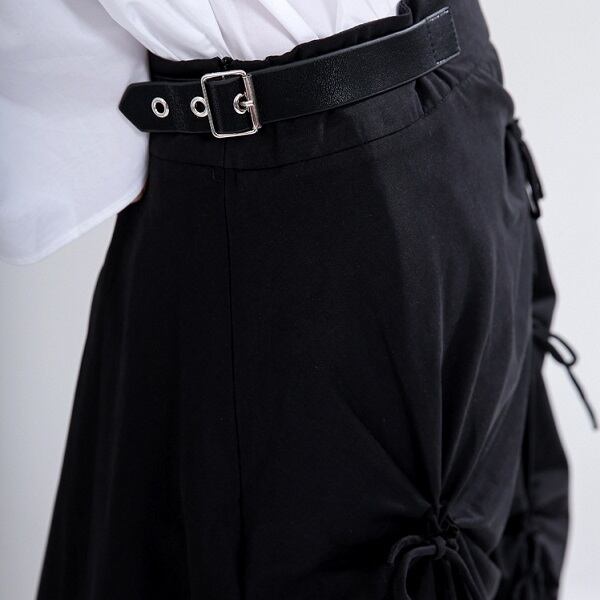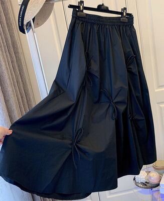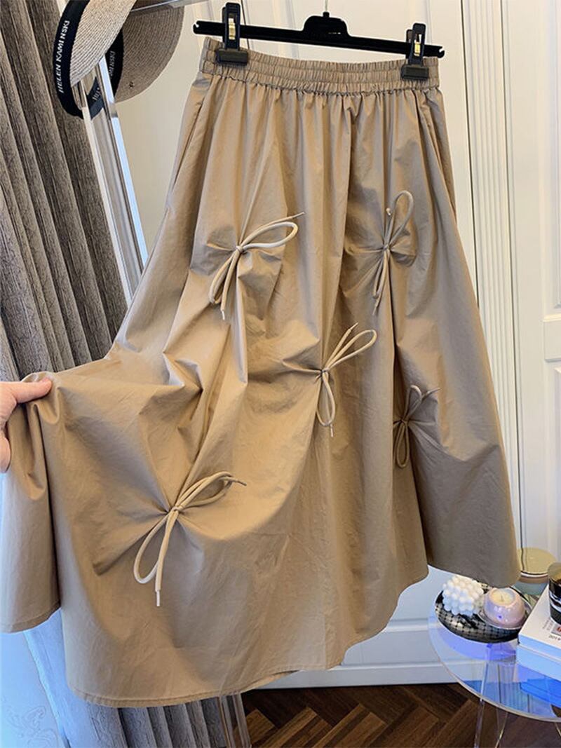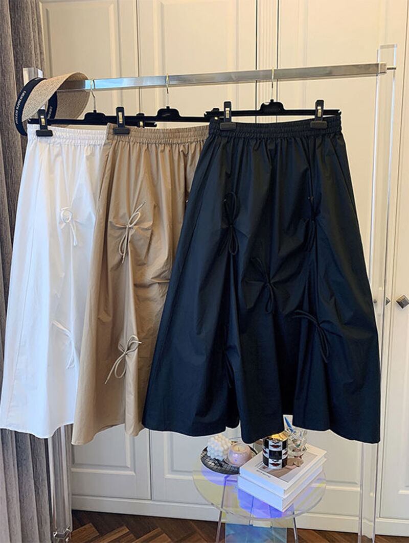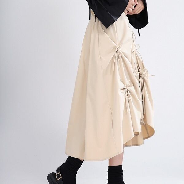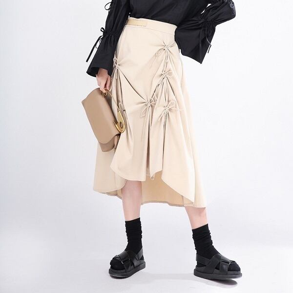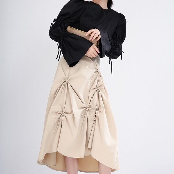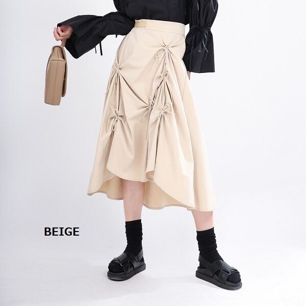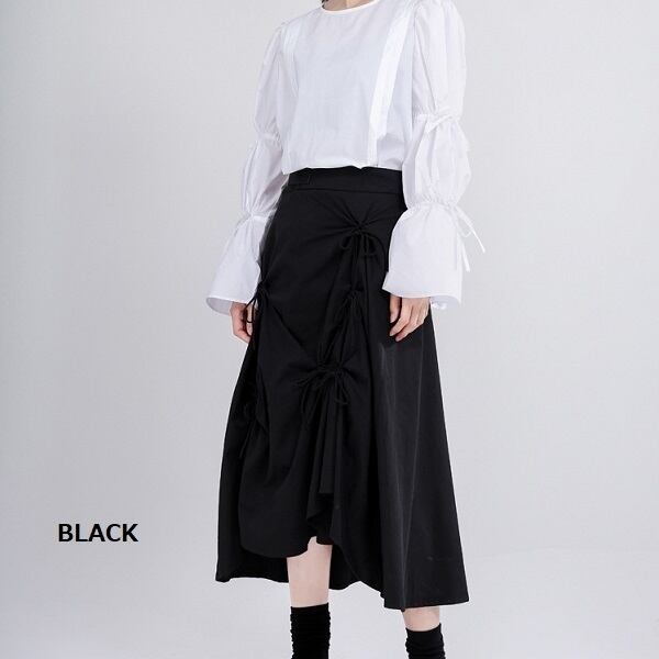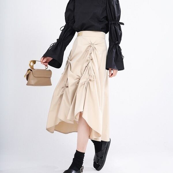 ギャザーリボンが不規則にデザインされたミモレ丈スカート