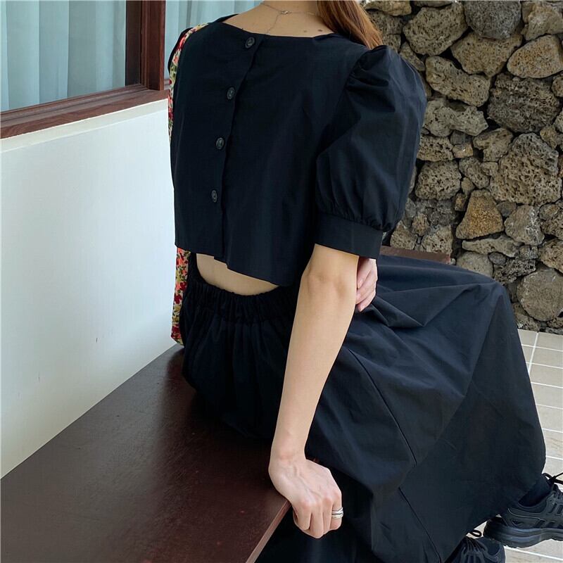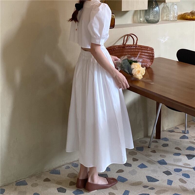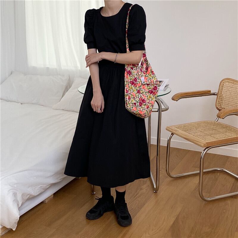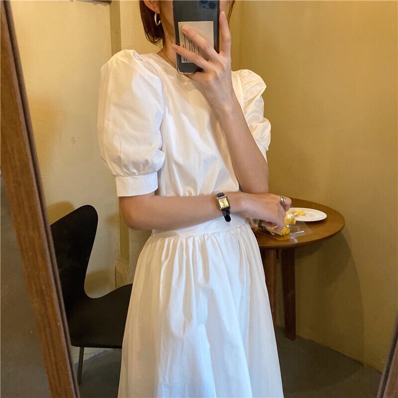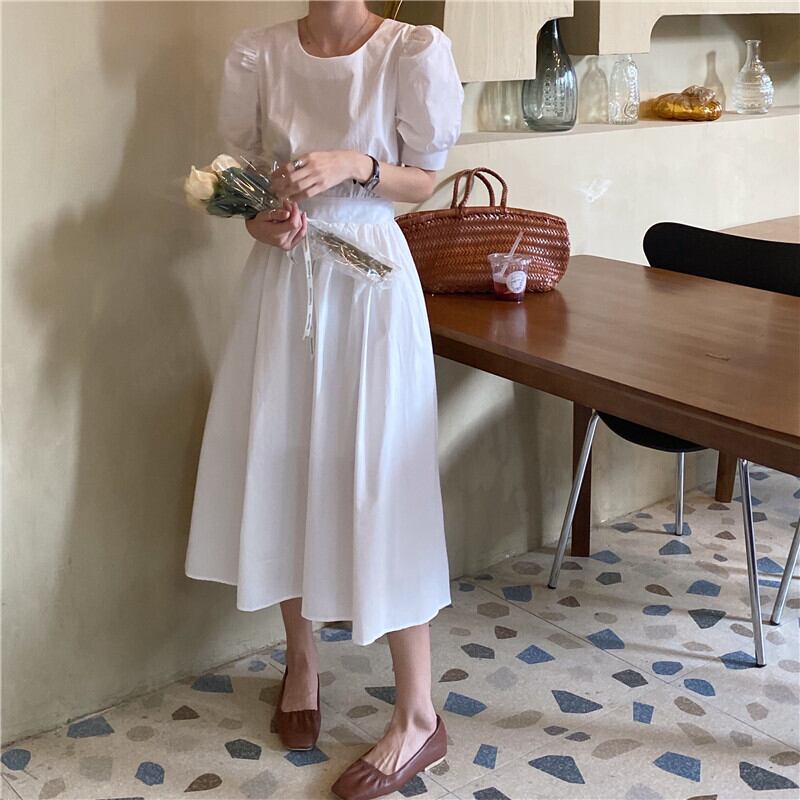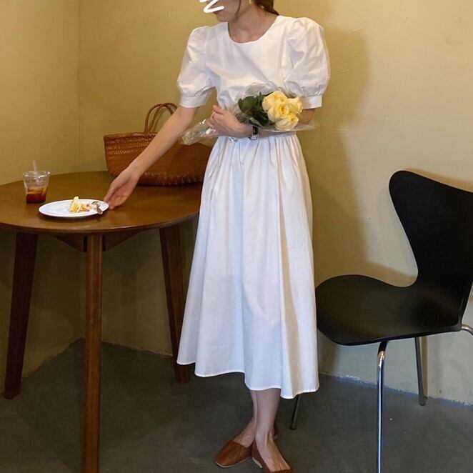 後ろ開き ワンピース パフスリーブ 半袖 ミモレ丈 ラウンドネック ロング丈 Aライン 無地 フレア モノトーン ハイウエスト バックボタン かわいい 大人可愛い きれいめ シンプル カジュアル 大人 上品 おしゃれ お洒落 かっこいい 大人可愛い 大人女子 こなれ感 ラフ ラブリー キュート ガーリー ルーズ モード系 10代 20代 30代 ゆったり レディース 着回し 普段使い 重ね着 韓国系 オルチャン ファッション コーデ 体系カバー 流行 インスタ映え ホワイト 白 ブラック 黒