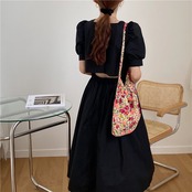 無地のモノトーンワンピースはシンプルで須賀、パフスリーブの袖が女性らしいシルエットに。
