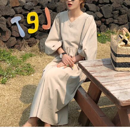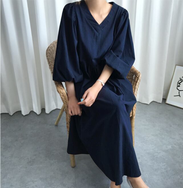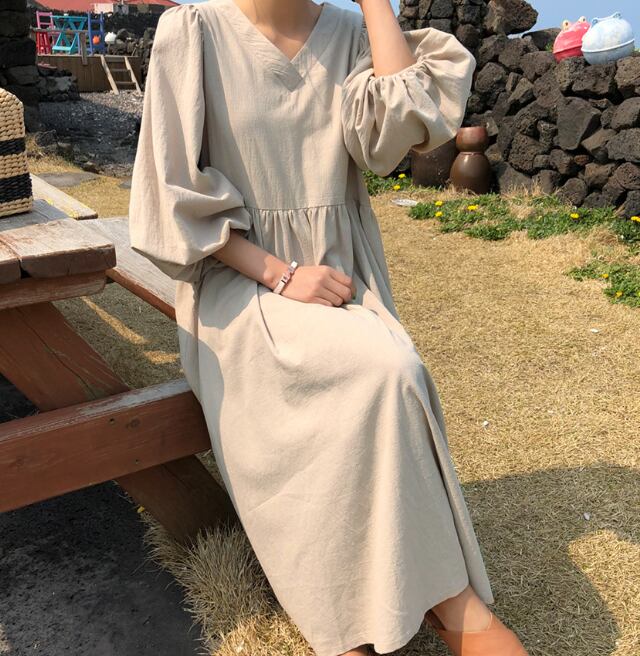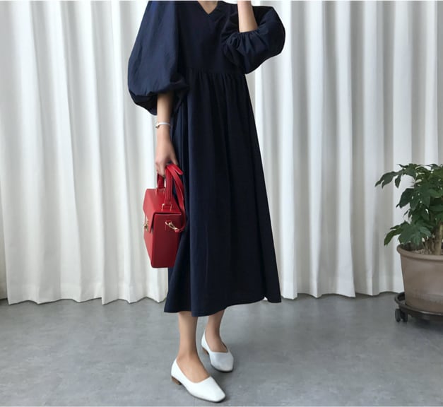 Vネック ミモレ丈 ワンピース 5分丈 ボリュームスリーブ Aライン フレア ハイウエスト ロング丈 レトロ ランタンスリーブ ギャザー ゆったり 無地 かわいい 大人可愛い きれいめ シンプル カジュアル 大人 上品 おしゃれ お洒落 かっこいい 大人可愛い 大人女子 こなれ感 ラフ ラブリー キュート ガーリー ルーズ モード系 10代 20代 30代 40代 レディース 着回し 普段使い 重ね着 韓国系 オルチャン ファッション コーデ 体系カバー 流行 インスタ映え ネイビー 紺 ベージュ