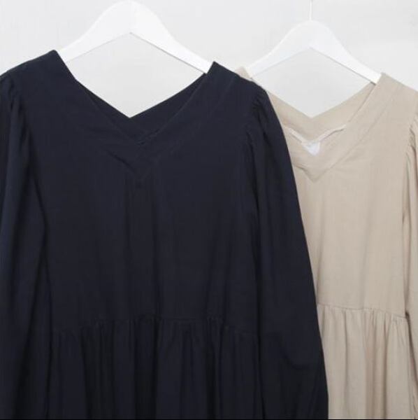 ふんわりとしたシルエットが柔らかな無地ワンピースです。