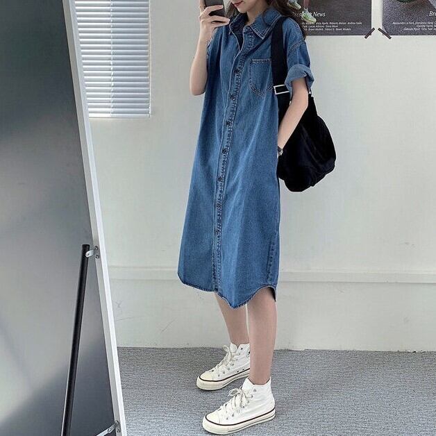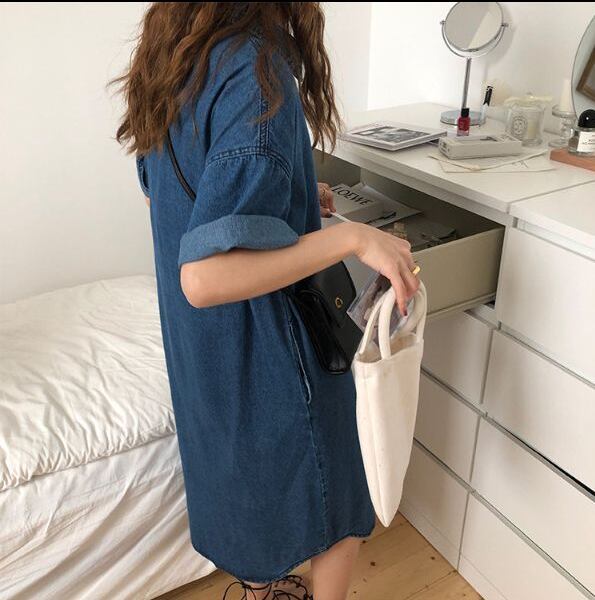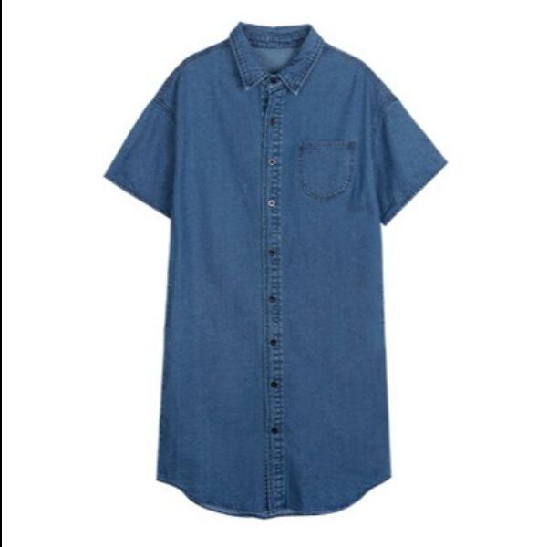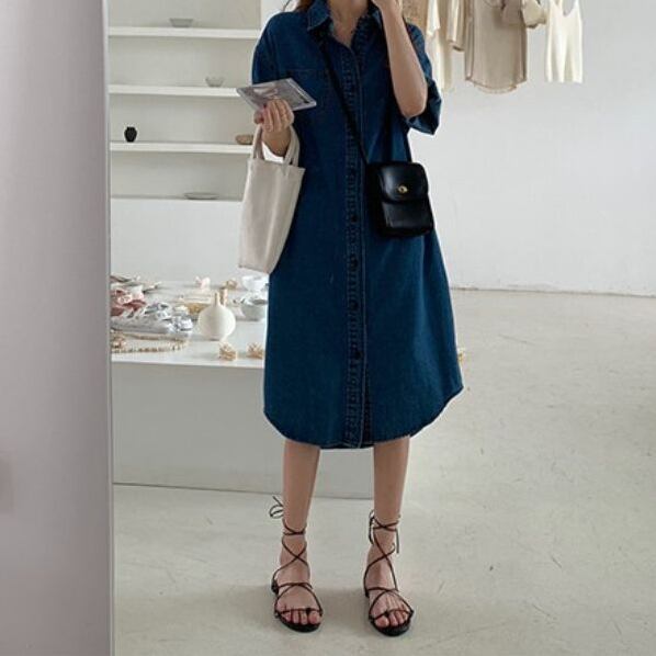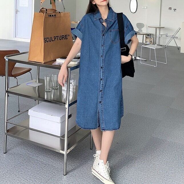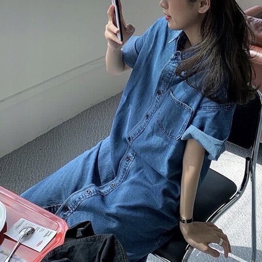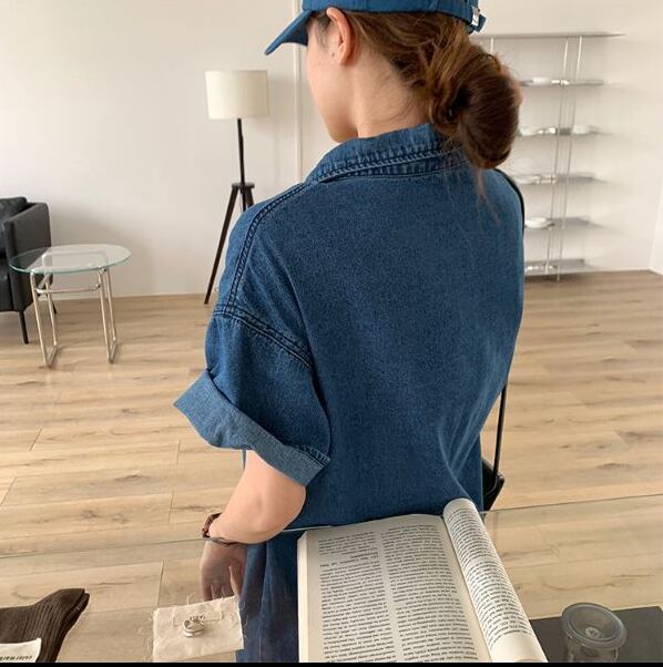 デニム シャツワンピース 半袖 前開き ひざ下 ストレート ブルー レトロ 古着風 無地 ボーイッシュ ストリート 羽織 かわいい 大人可愛い きれいめ シンプル カジュアル 大人 上品 おしゃれ お洒落 かっこいい 大人可愛い 大人女子 こなれ感 ラフ ラブリー キュート ガーリー ルーズ モード系 マタニティ 20代 30代 ゆったり レディース 着回し 普段使い 重ね着 韓国系 オルチャン ファッション コーデ 体系カバー 流行 インスタ映え
