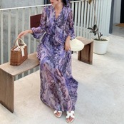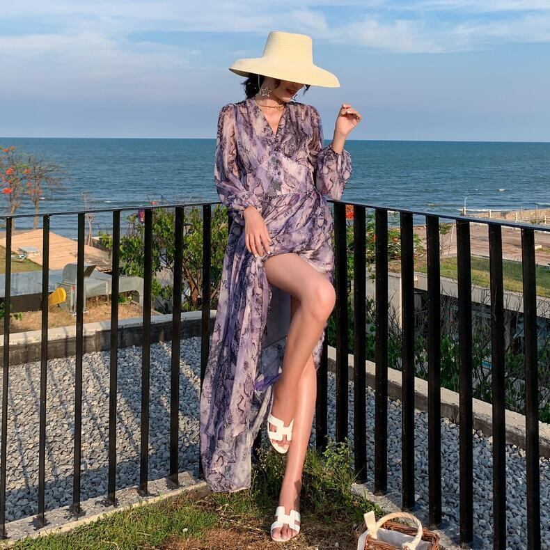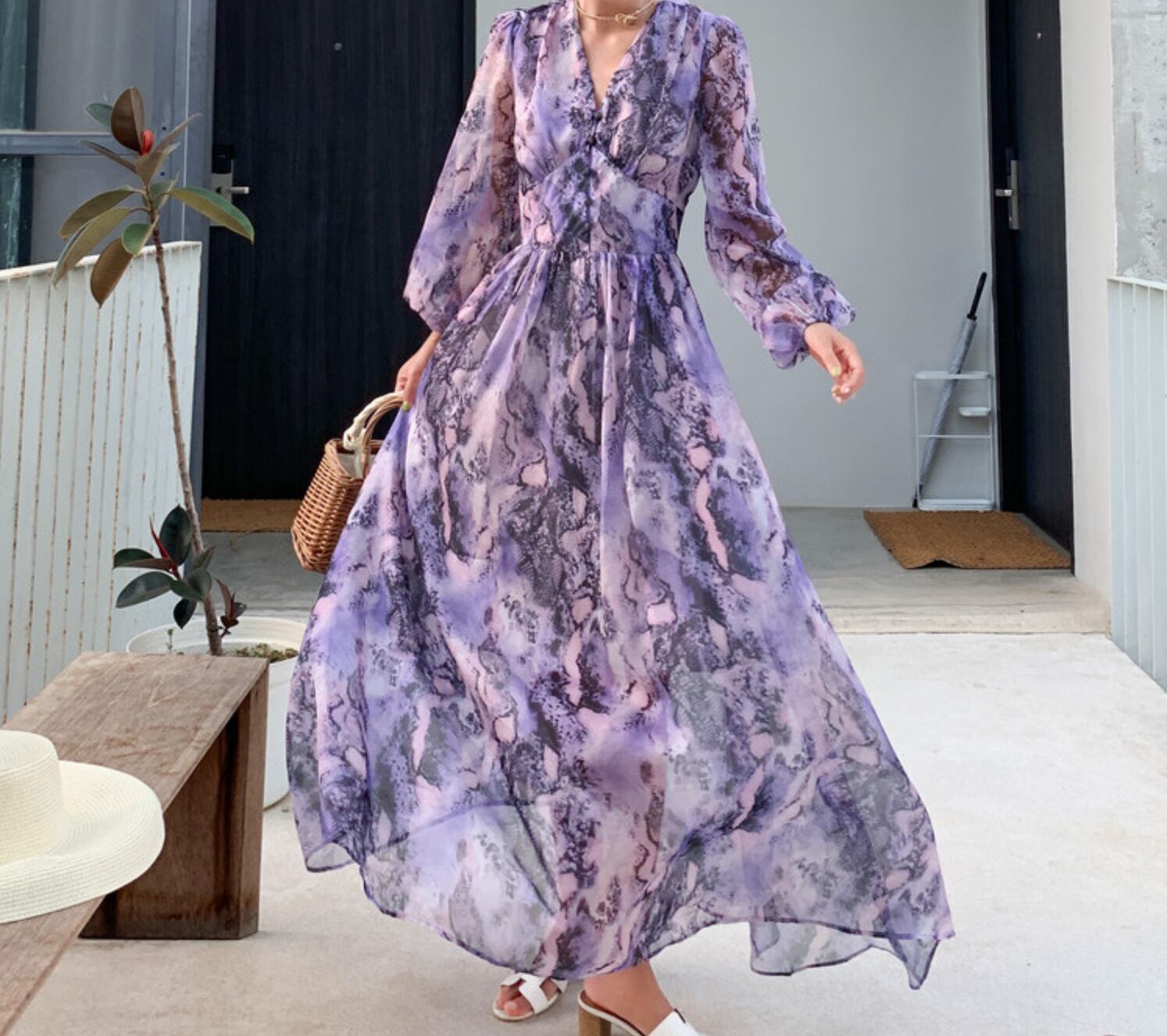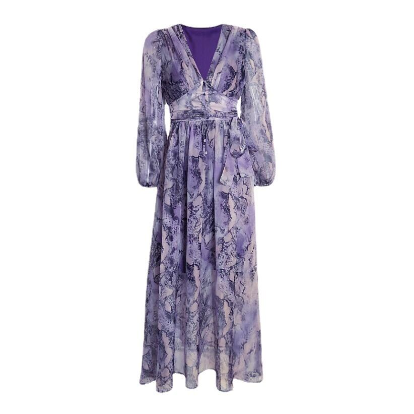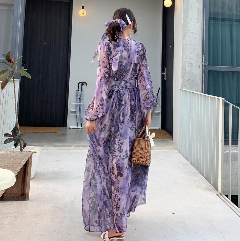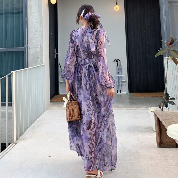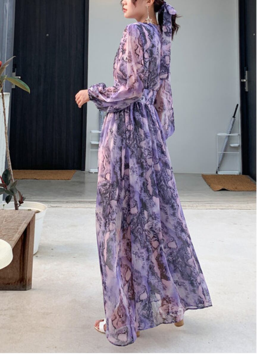 ワンピース 上着 人気 おすすめ おしゃれ お洒落 激安 安い 送料無料 プチプラ 長袖 ロング Vネック ウエスト マキシ ロングスカート フレア 柄 透け プリント リボン 春 スプリング サマー 夏 レディース 女性用 20代 30代 マタニティ 妊婦 S M L XL 大きめ ゆったり 紫 パープル ラベンダー ピンク 春カラー ニュアンスカラー デート フェミニン ビーチ ホリデー 旅行 お出かけ