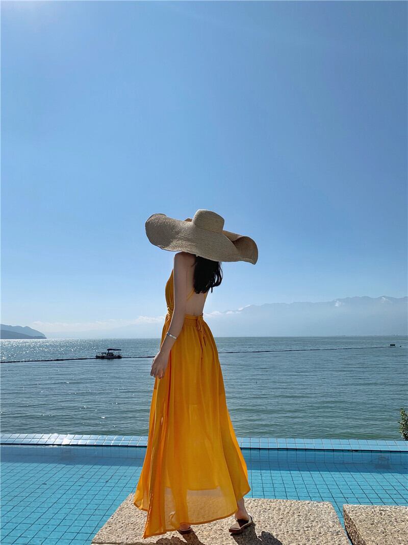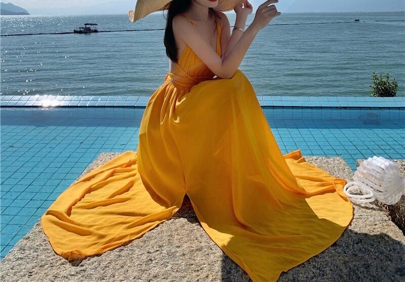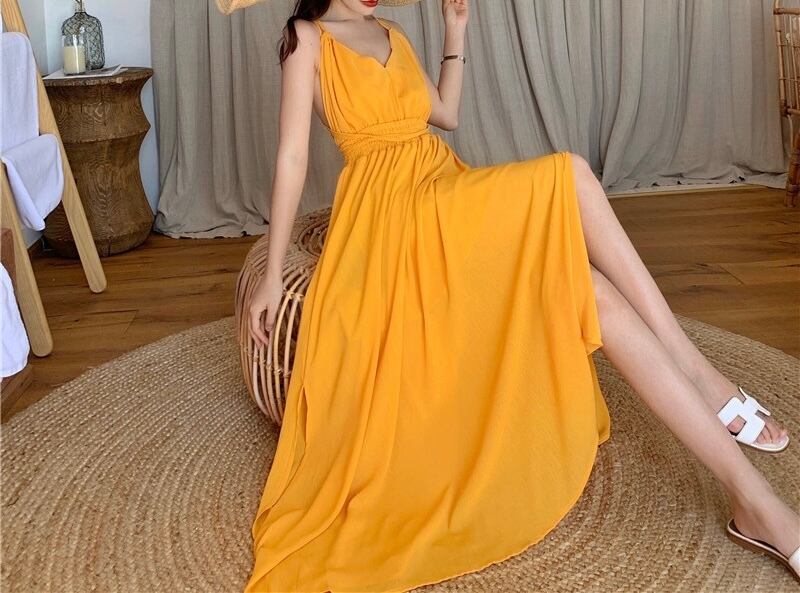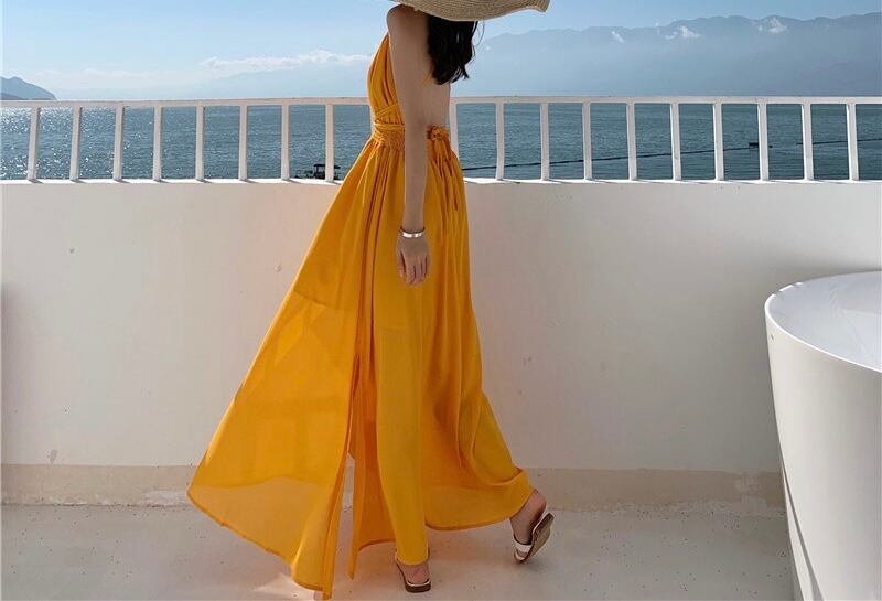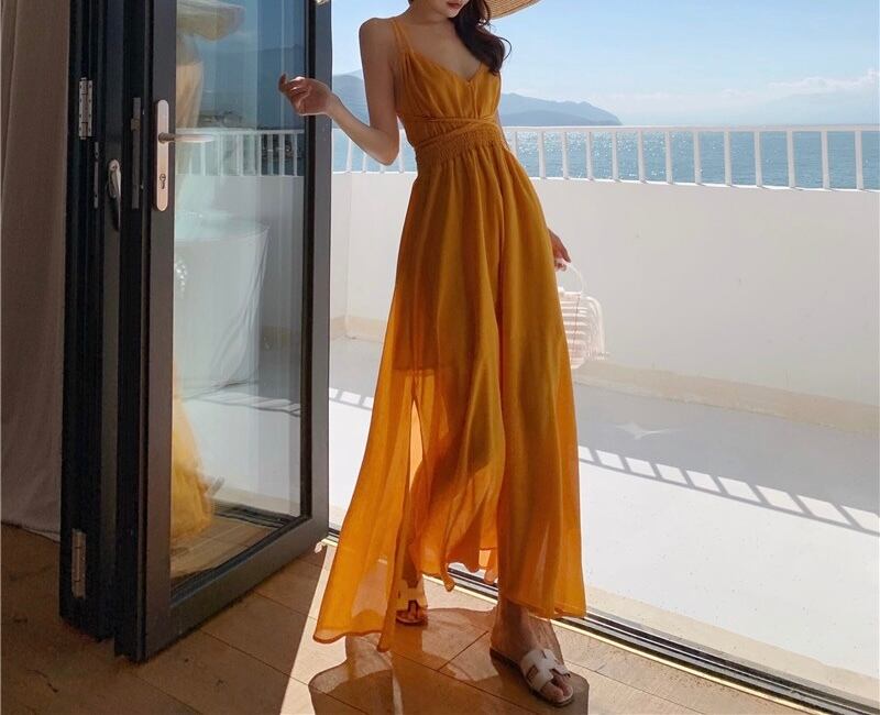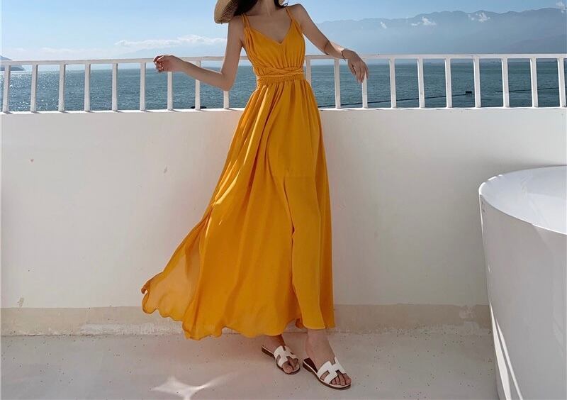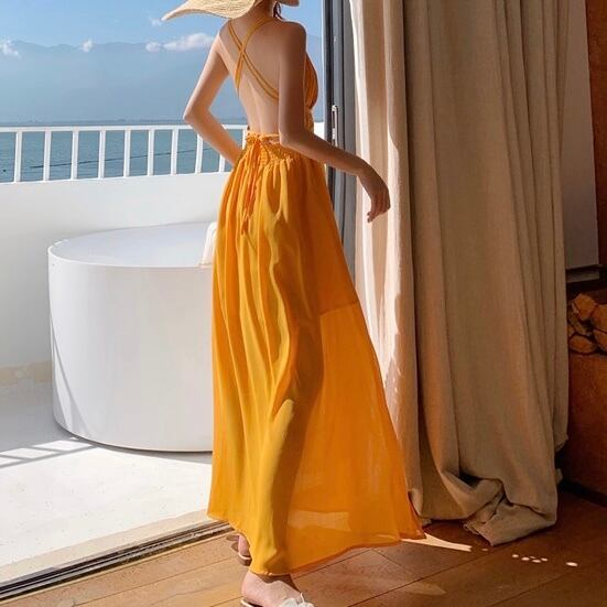 ワンピース ワンカラー ワントーン キャミソール バッククロス 袖なし 肌見せ 露出 背中見せ シフォン 柔らか 透け感 レディース 大人女子 可愛い かわいい きれいめ 綺麗系 エレガント セクシー おしゃれ お洒落 オシャレ イエロー 黄色 鮮やか リゾート 海 ビーチ プール 夏 サマー 観光 旅行 お出かけ レジャー 20代 10代 アラサー デート 送料無料 送料込み