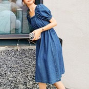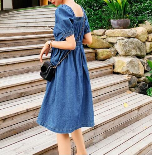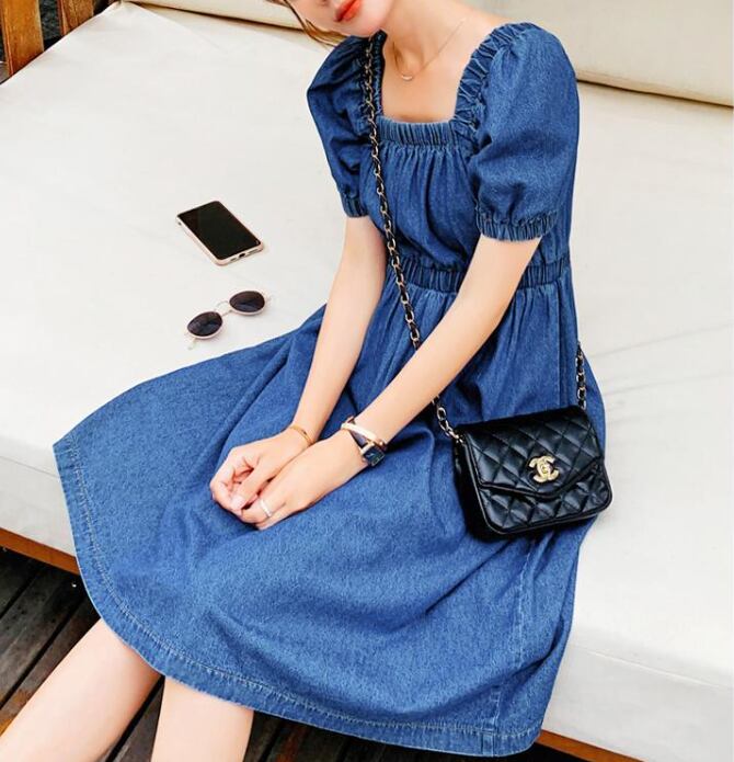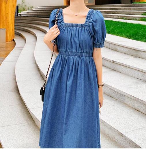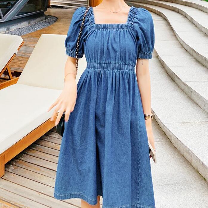 スクエアネック ひざ丈 ワンピース パフスリーブ 半袖 デニム ブルー Aライン レトロ 古着風 ハイウエスト フレア ロリータ シャーリング ゆったり かわいい 大人可愛い きれいめ シンプル カジュアル 大人 上品 おしゃれ お洒落 かっこいい 大人可愛い 大人女子 こなれ感 ラフ ラブリー キュート ガーリー ルーズ モード系 10代 20代 学生 海 プール レディース 着回し 普段使い 重ね着 韓国系 オルチャン ファッション コーデ 体系カバー 流行 インスタ映え