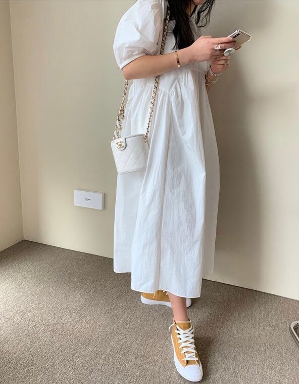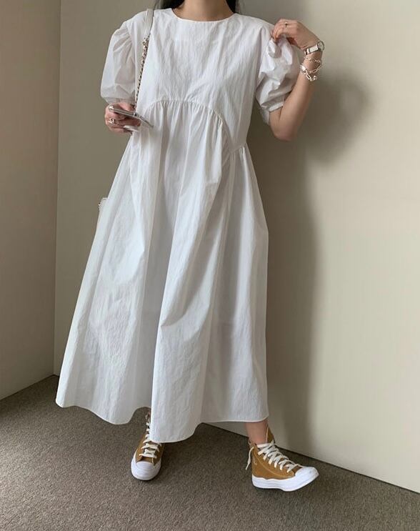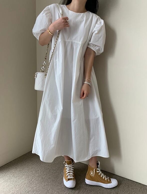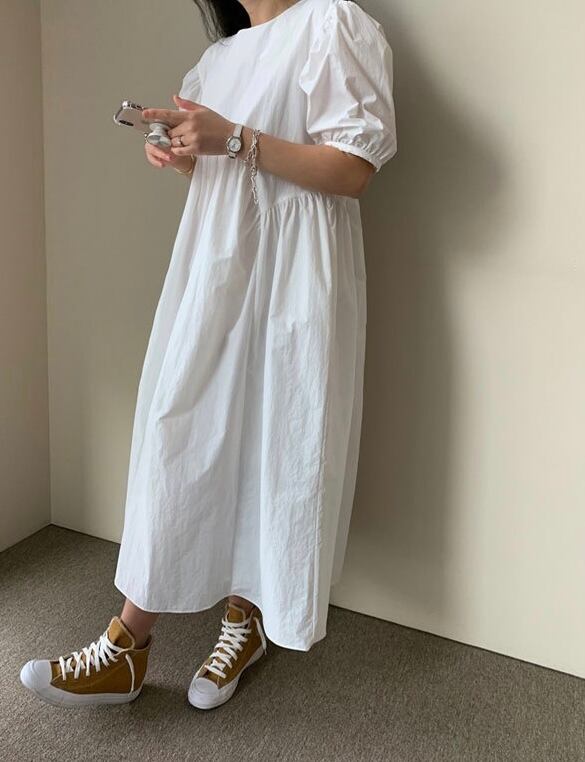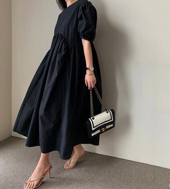 パフスリーブが可愛い、女性らしさ満点のオーバーサイズワンピース。