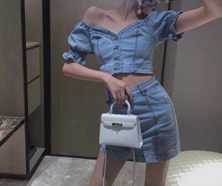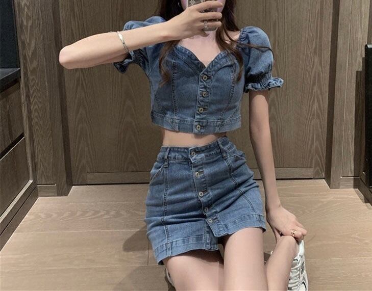 ショート丈トップスとミニ丈ボトムスがセクシーなデニムセットアップ。