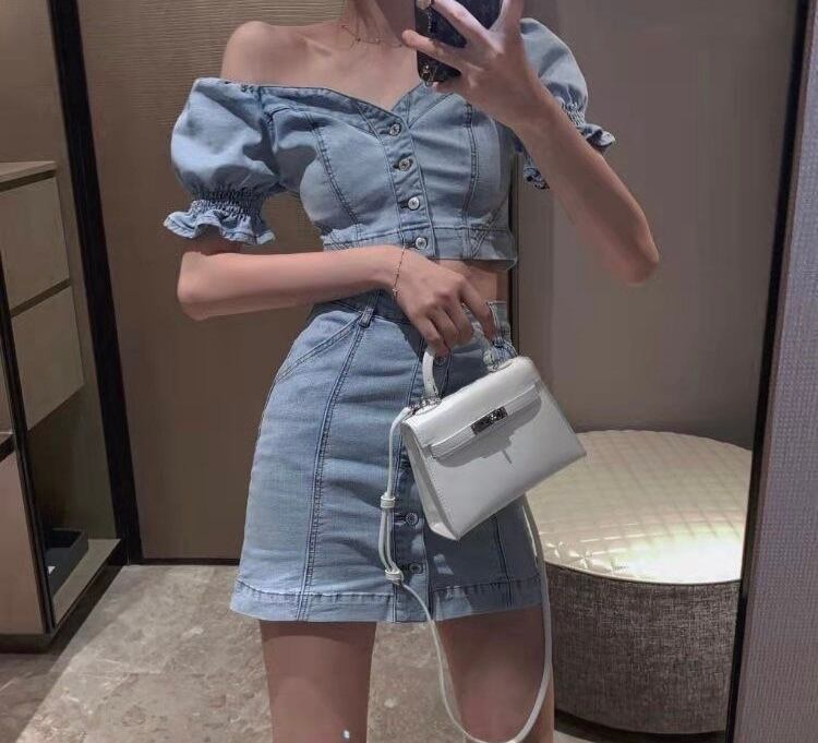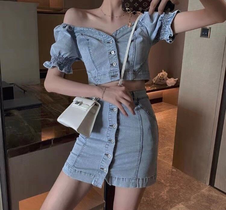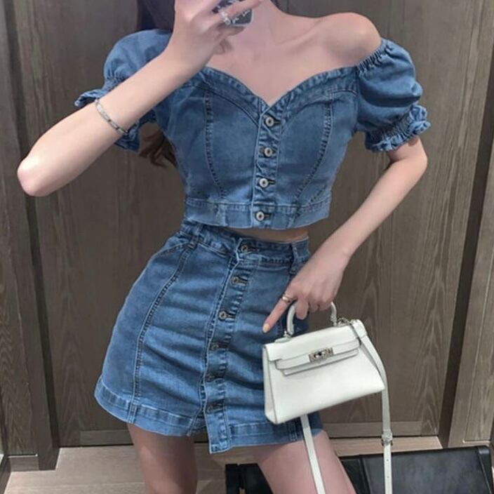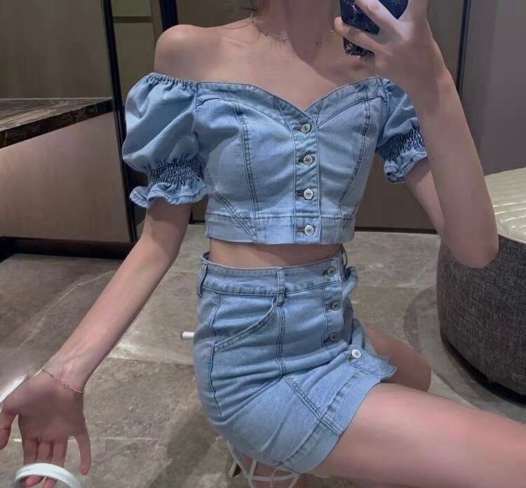 セットアップ 2点セット ツーピース ハイウエスト 脚長効果 デニム ミニ丈 ショート丈 トップス スカート 半袖 フリル 袖あり Vネック オフショルダー 肩見せ スリム 細身 パフスリーブ ライトブルー ダークブルー 青 水色 ワントーン 大きいサイズ S M L XL 2XL セクシー 大人女子 20代 可愛い かわいい キュート 露出 ギャル 夏 サマー プール ビーチ リゾート 海 涼しげ 韓国 旅行 観光 デート お出かけ ランチ 女子会 レディース 送料無料 送料込み