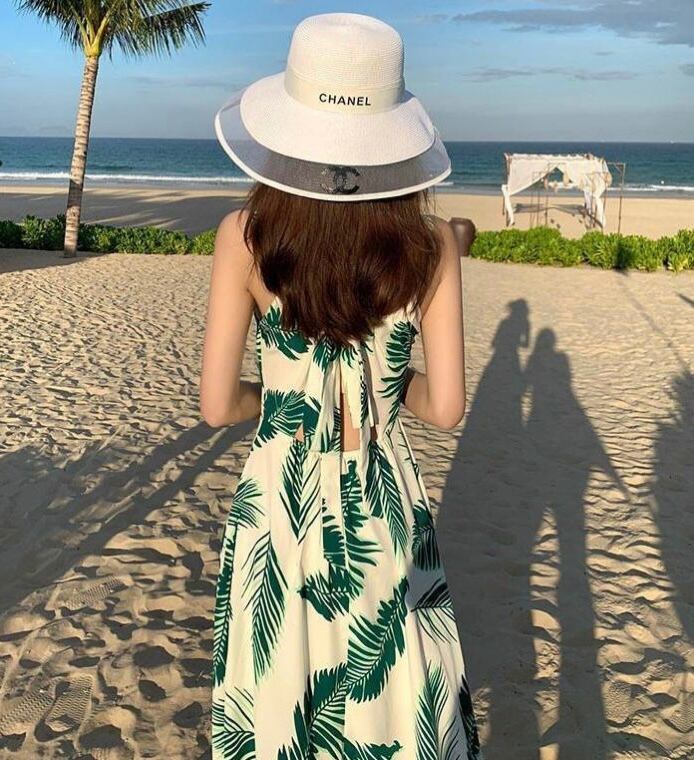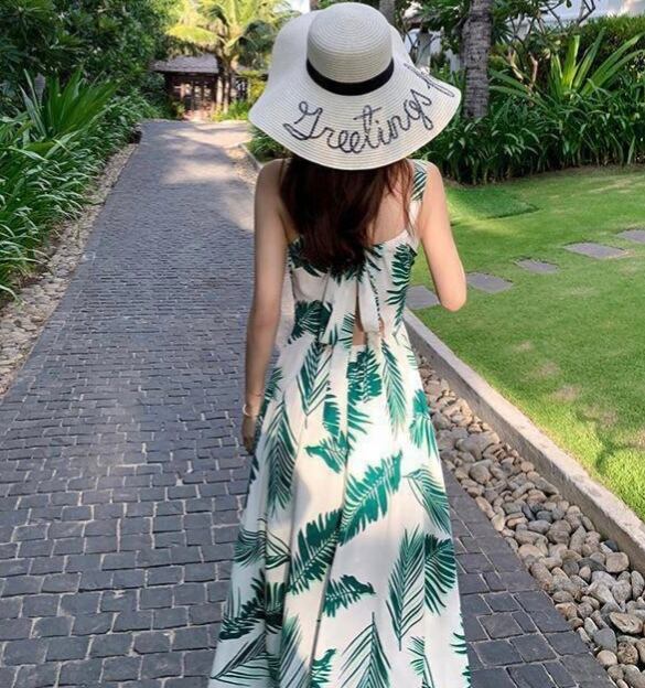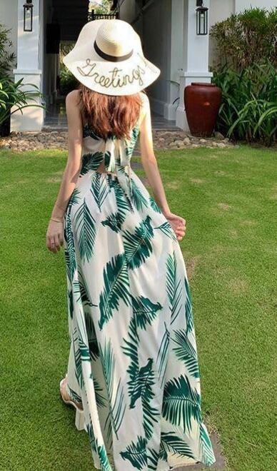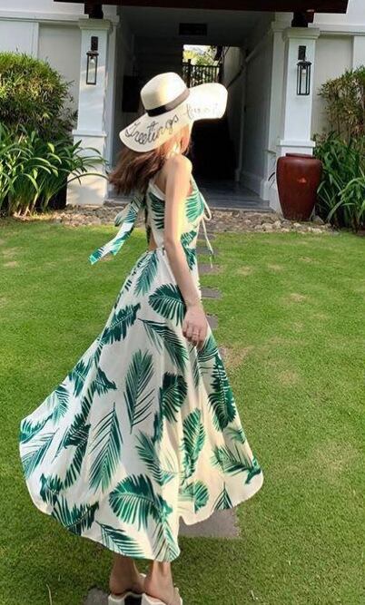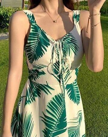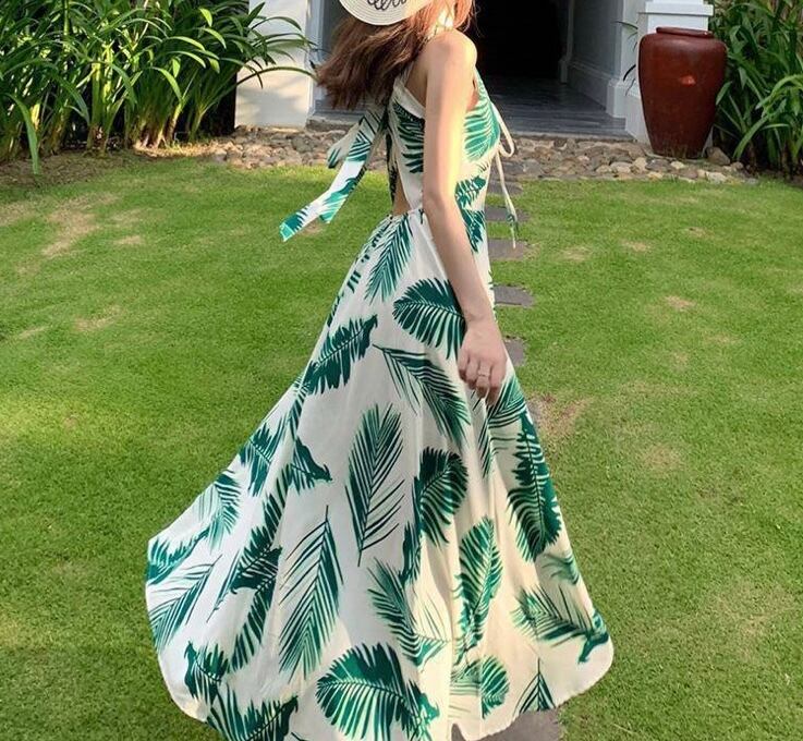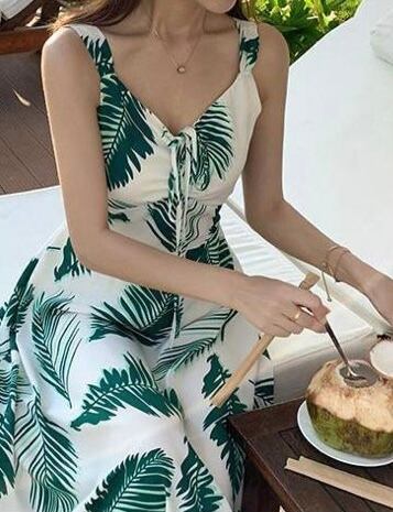バックシャンが可愛いおしゃれなリーフプリントリゾートワンピース。