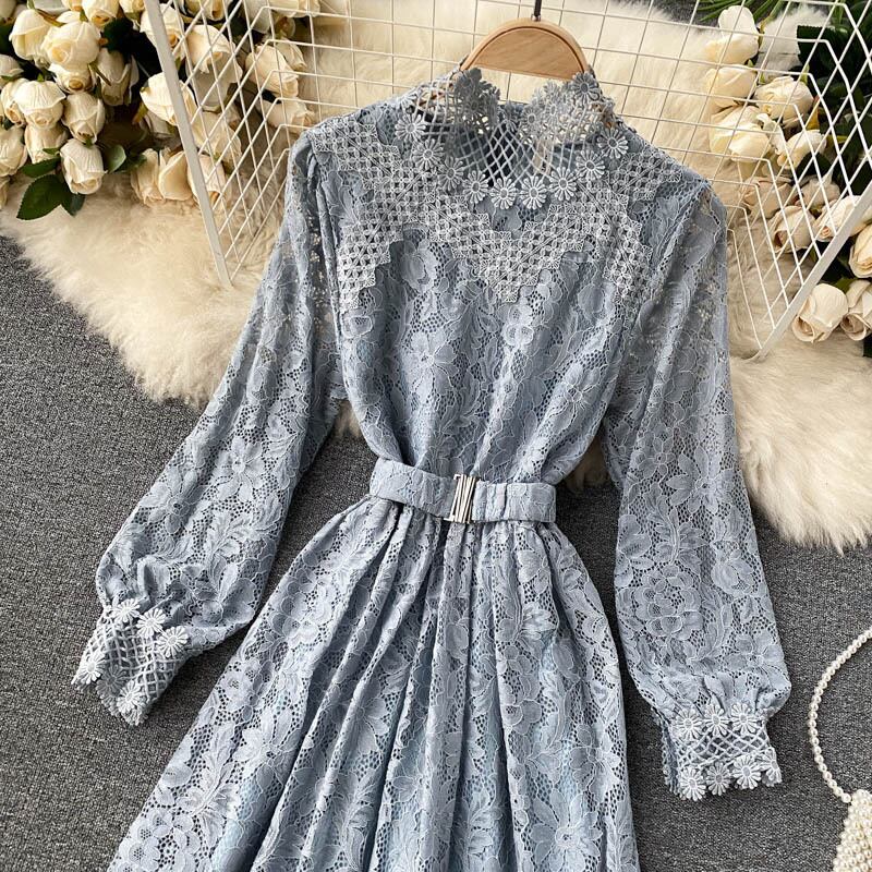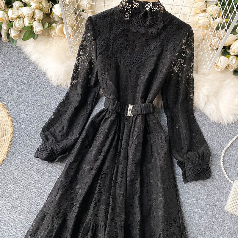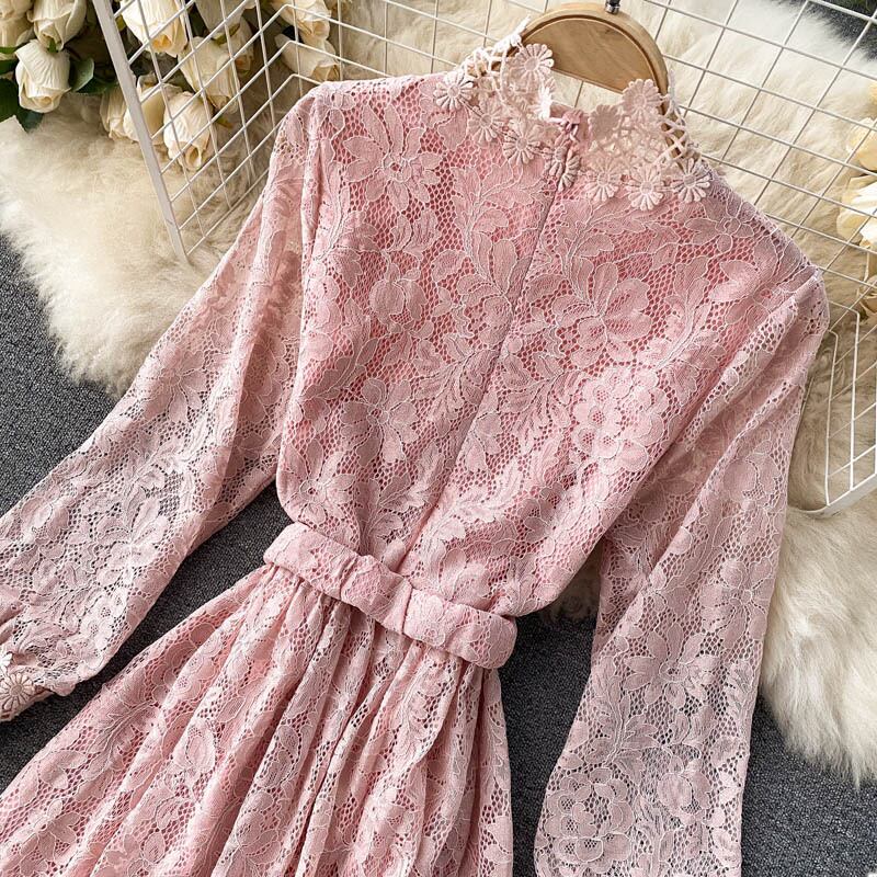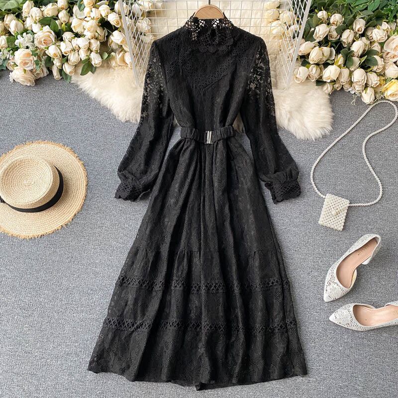 レース スタンドカラー ワンピース 長袖 透け感 ハイウエスト ベルト ロング丈 Aライン フレア スタイルアップ かわいい 大人可愛い きれいめ シンプル カジュアル 大人 上品 おしゃれ お洒落 かっこいい 大人可愛い 大人女子 こなれ感 ラフ ラブリー キュート ガーリー ルーズ モード系 10代 20代 30代 刺繍 レトロ ロリータ レディース 着回し 普段使い 重ね着 韓国系 オルチャン ファッション コーデ 体系カバー 流行 インスタ映え ピンク ブラック 黒 ベージュ ブルー 青