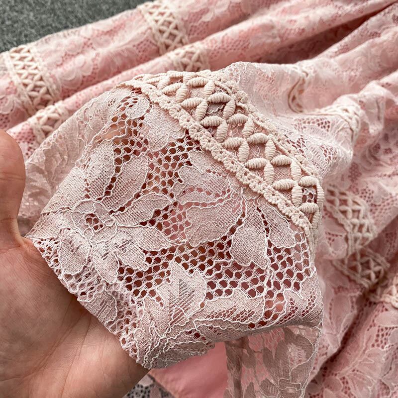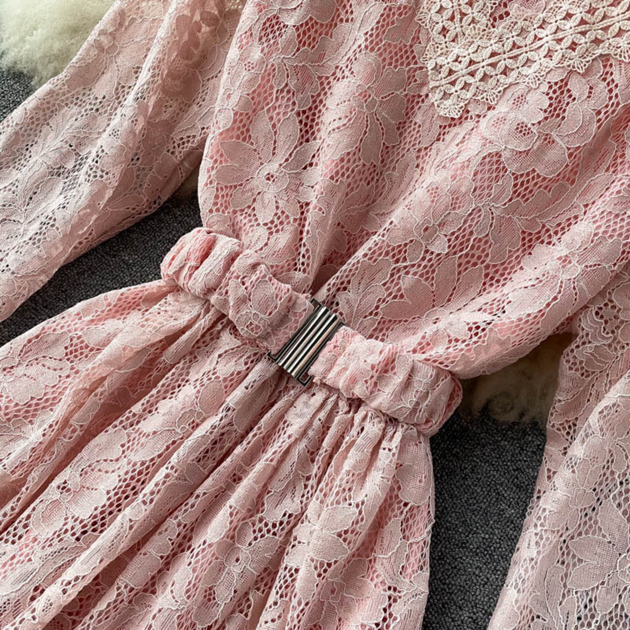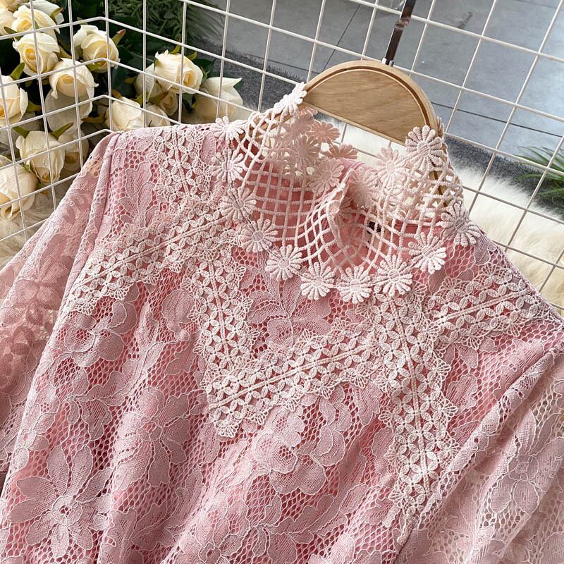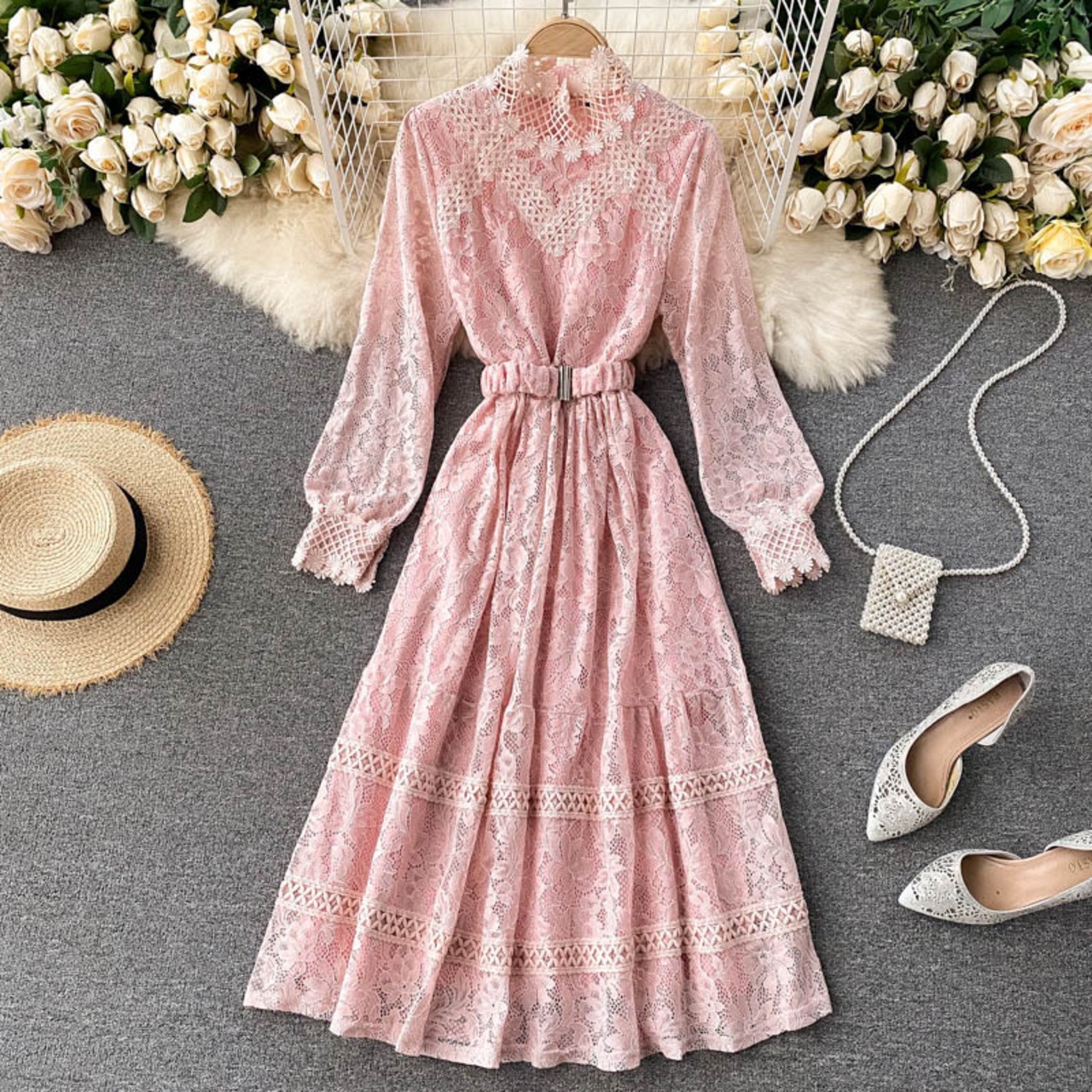 レース スタンドカラー ワンピース 長袖 透け感 ハイウエスト ベルト ロング丈 Aライン フレア スタイルアップ かわいい 大人可愛い きれいめ シンプル カジュアル 大人 上品 おしゃれ お洒落 かっこいい 大人可愛い 大人女子 こなれ感 ラフ ラブリー キュート ガーリー ルーズ モード系 10代 20代 30代 刺繍 レトロ ロリータ レディース 着回し 普段使い 重ね着 韓国系 オルチャン ファッション コーデ 体系カバー 流行 インスタ映え ピンク ブラック 黒 ベージュ ブルー 青