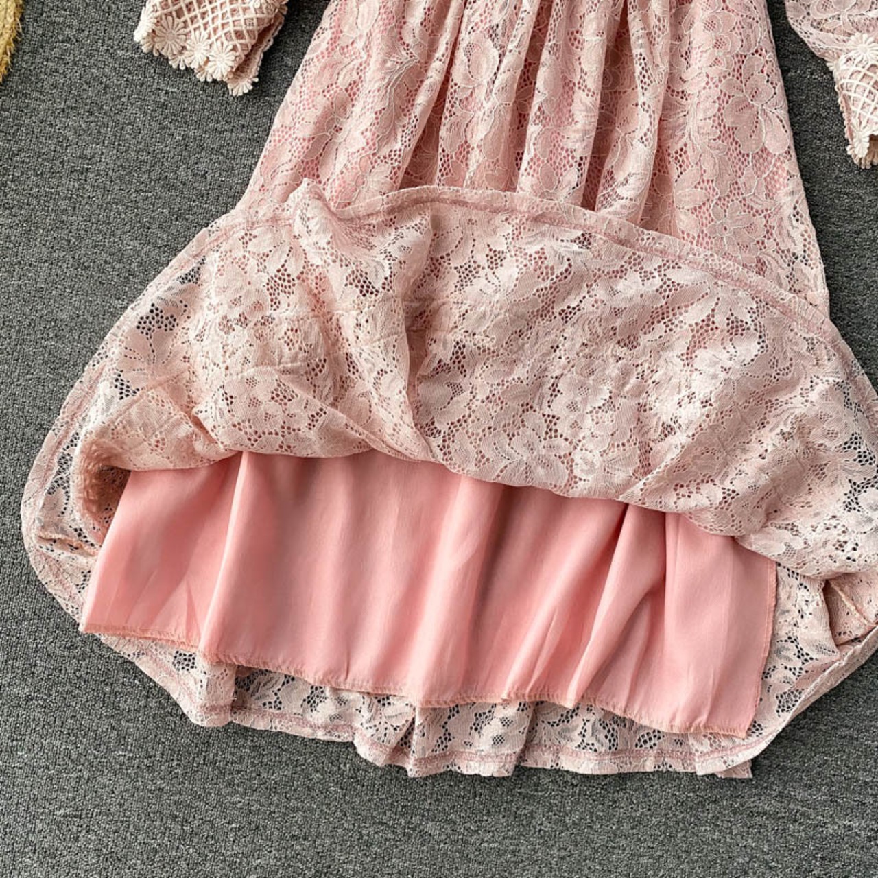 全体にレースがあしらわれた上品な印象の長袖ワンピースです。