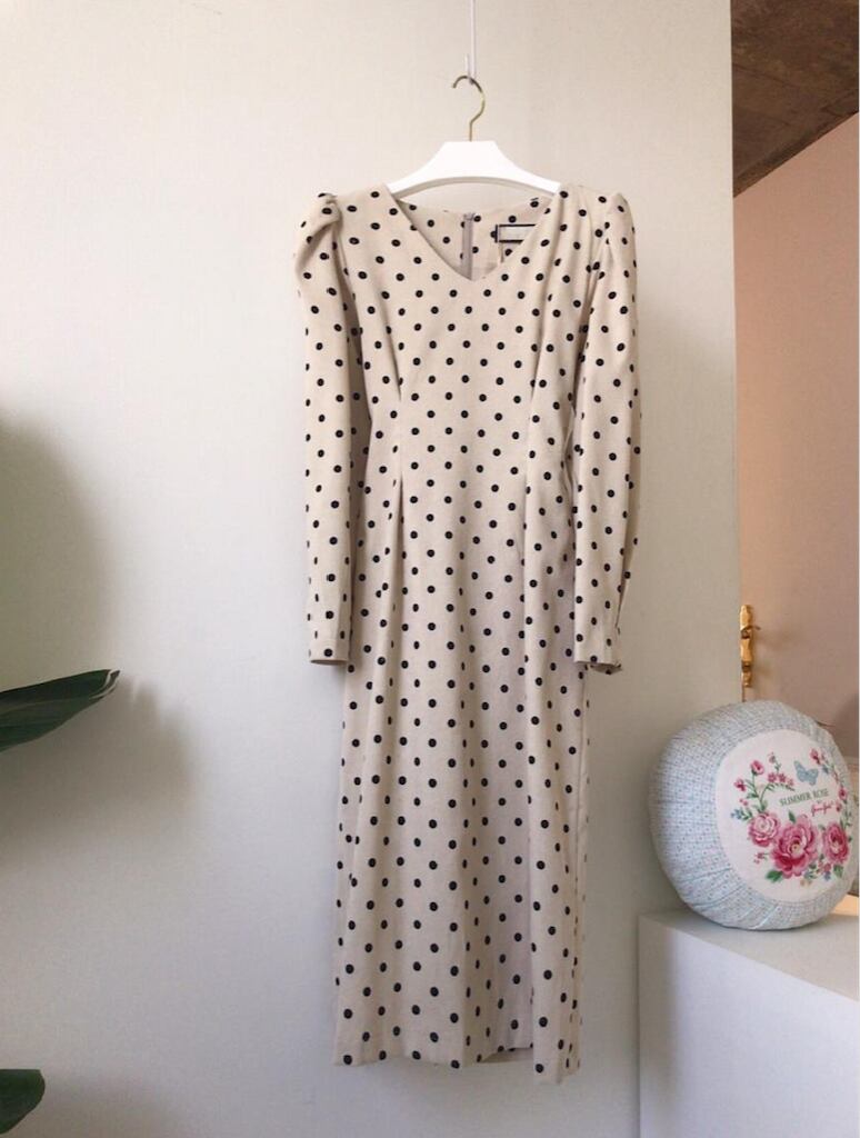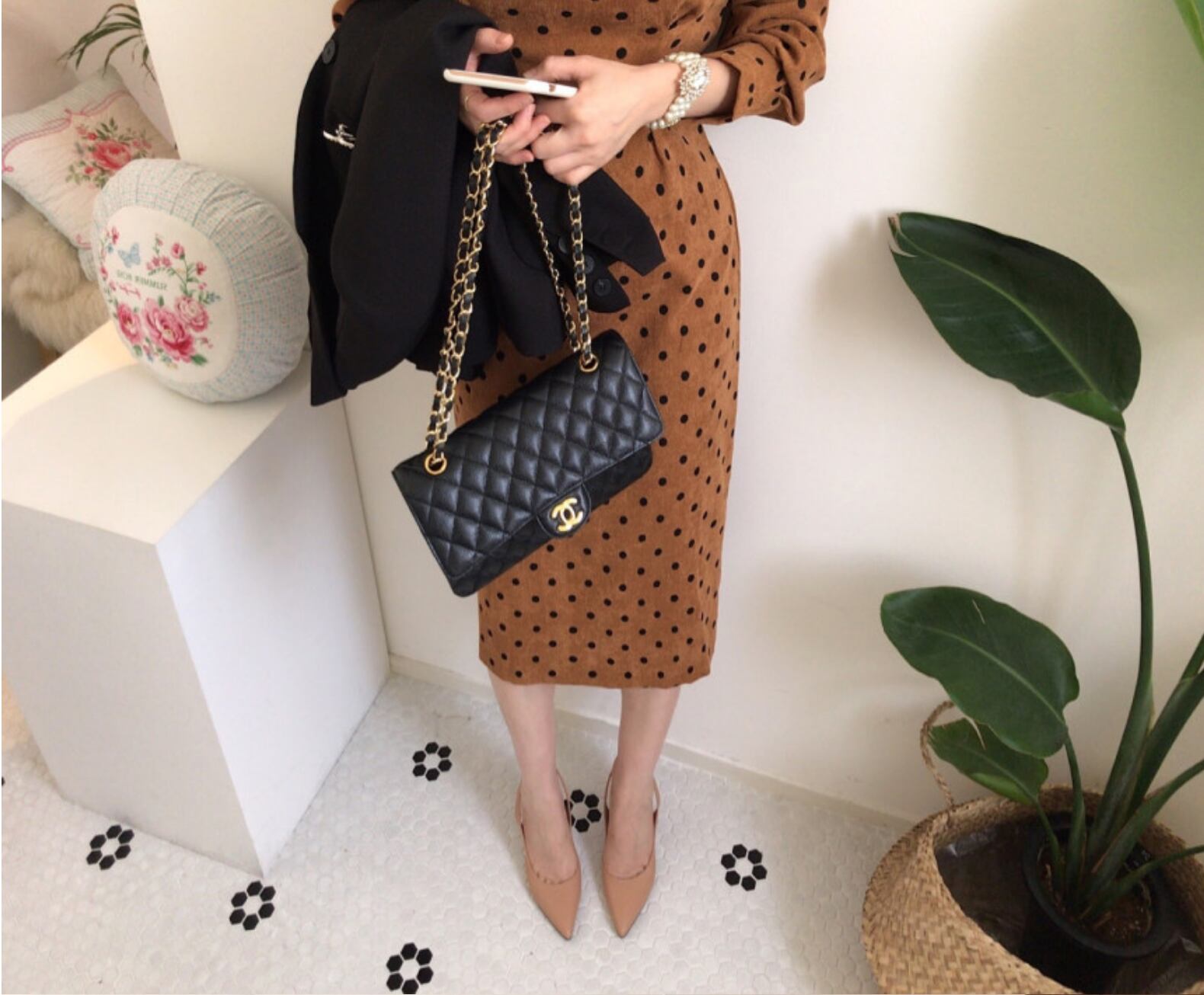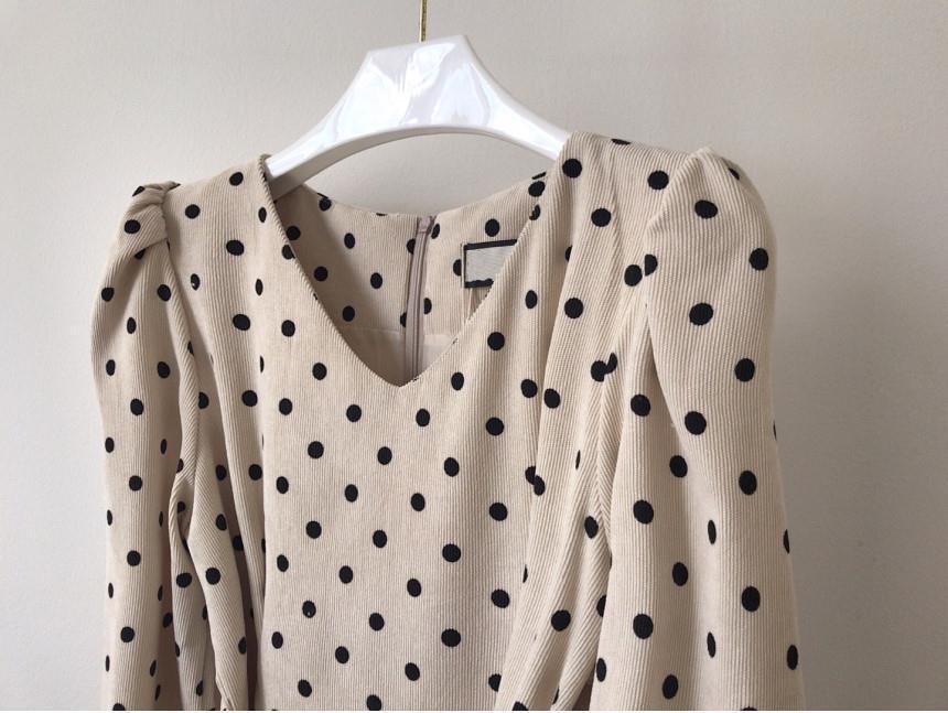 コーデュロイ生地とドット柄のレトロなワンピース。