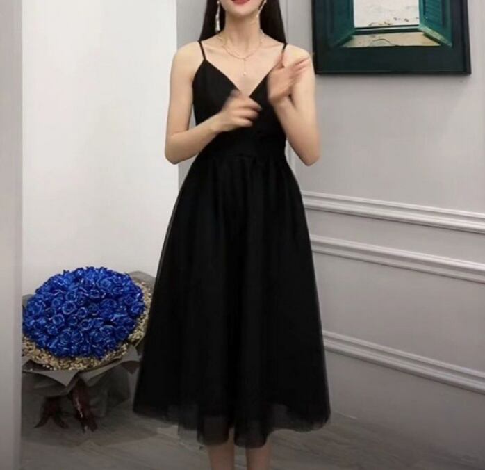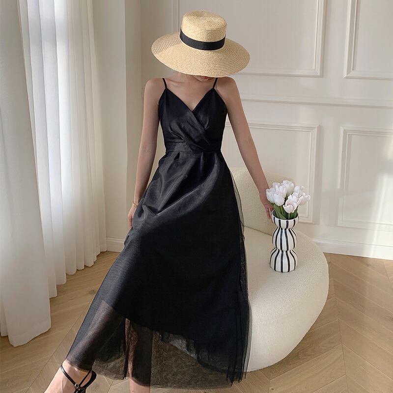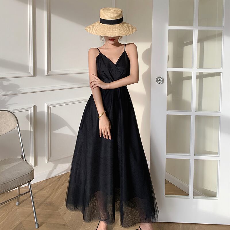 すっきりしたキャミトップとメッシュのボリュームスカートのバランスがかわいいドレス。