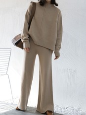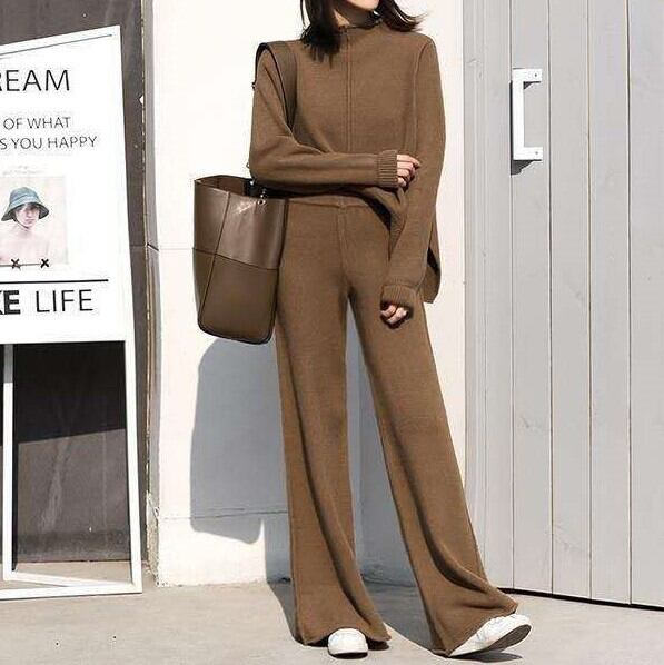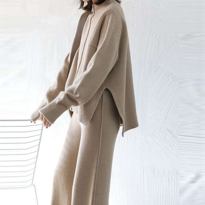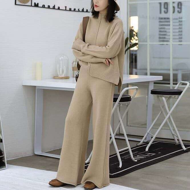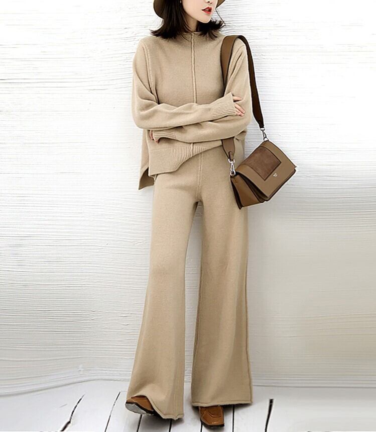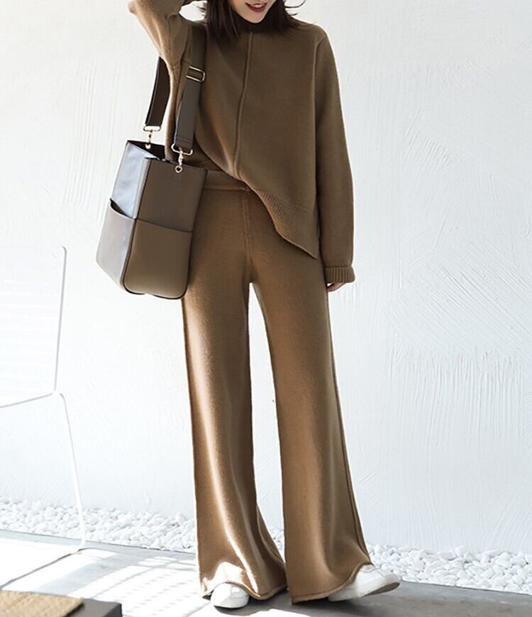ニット ツーピース セットアップ ハイネック 長袖 ワイドパンツ ゆったり くすみカラー セーター ボトムス トップス かわいい 大人可愛い きれいめ シンプル カジュアル 大人 上品 おしゃれ お洒落 かっこいい 大人可愛い 大人女子 こなれ感 ラフ ラブリー キュート ガーリー ルーズ モード系 10代 20代 30代 40代 レディース 着回し 普段使い 重ね着 韓国系 オルチャン ファッション コーデ 体系カバー 流行 インスタ映え ベージュ ブラウン 茶 グレー 灰色