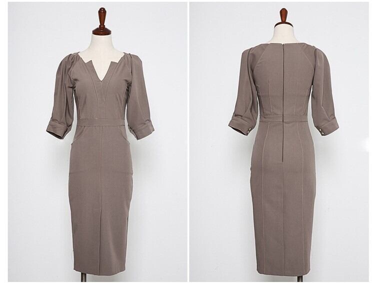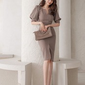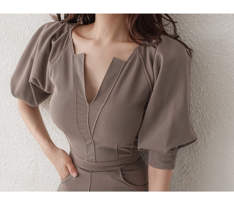 Vネック ランタンスリーブ ワンピース タイト パフスリーブ 5分袖 ハイウエスト スリット スリムフィット セクシー 着やせ かわいい 大人可愛い きれいめ シンプル カジュアル 大人 上品 おしゃれ お洒落 かっこいい 大人可愛い 大人女子 こなれ感 ラフ ラブリー キュート ガーリー ルーズ モード系 入学式 謝恩会 20代 30代 お呼ばれ 通勤 オフィス OL レディース 着回し 普段使い 重ね着 韓国系 オルチャン ファッション コーデ 体系カバー 流行 インスタ映え