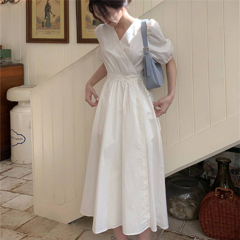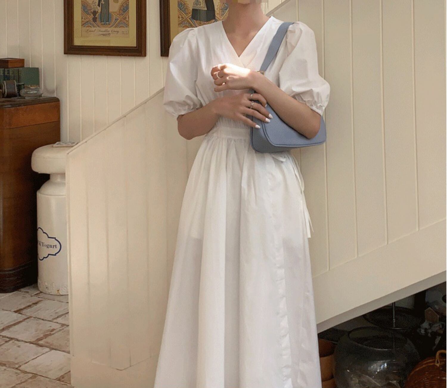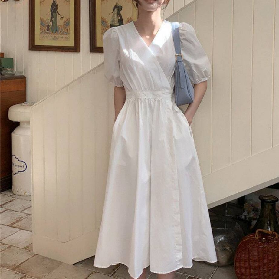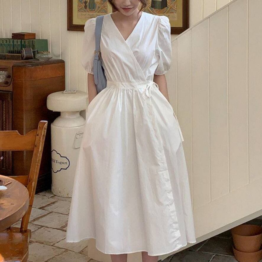 ワンピース 上着 人気 おすすめ おしゃれ お洒落 激安 安い 送料無料 プチプラ 半袖 Vネック パフスリーブ ウエスト ボリュームスリーブ Aライン 無地 ふわふわ リボン ポリエステル 可愛い かわいい 韓国 シンプル カジュアル きれいめ 大人 上品 春 スプリング サマー 夏 レディース 女性用 20代 30代 S M L XL 白 ホワイト 春カラー デート フェミニン ナチュラル