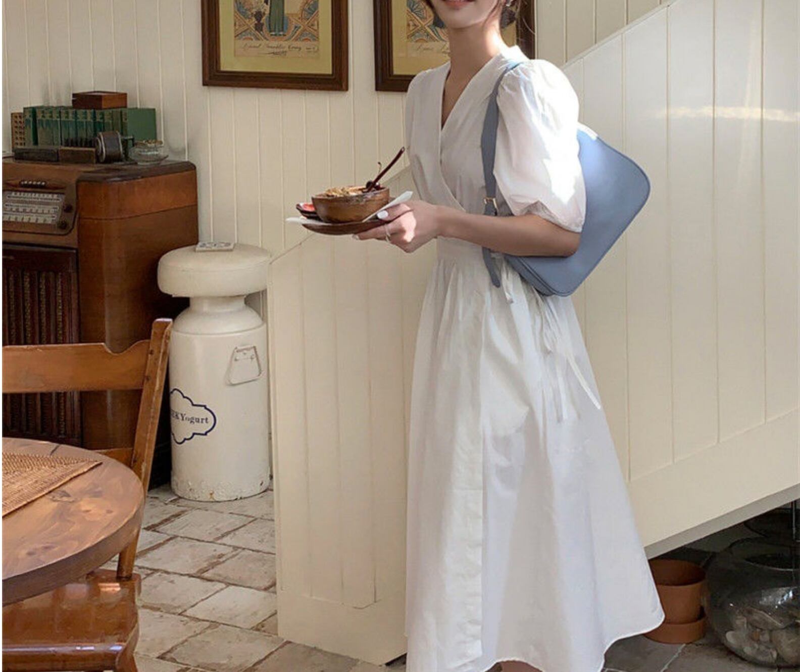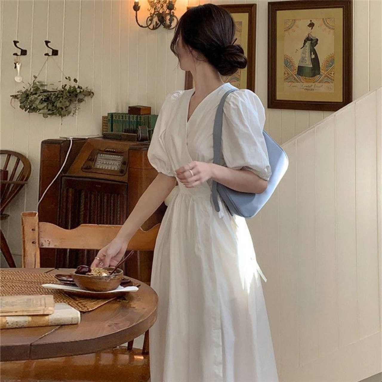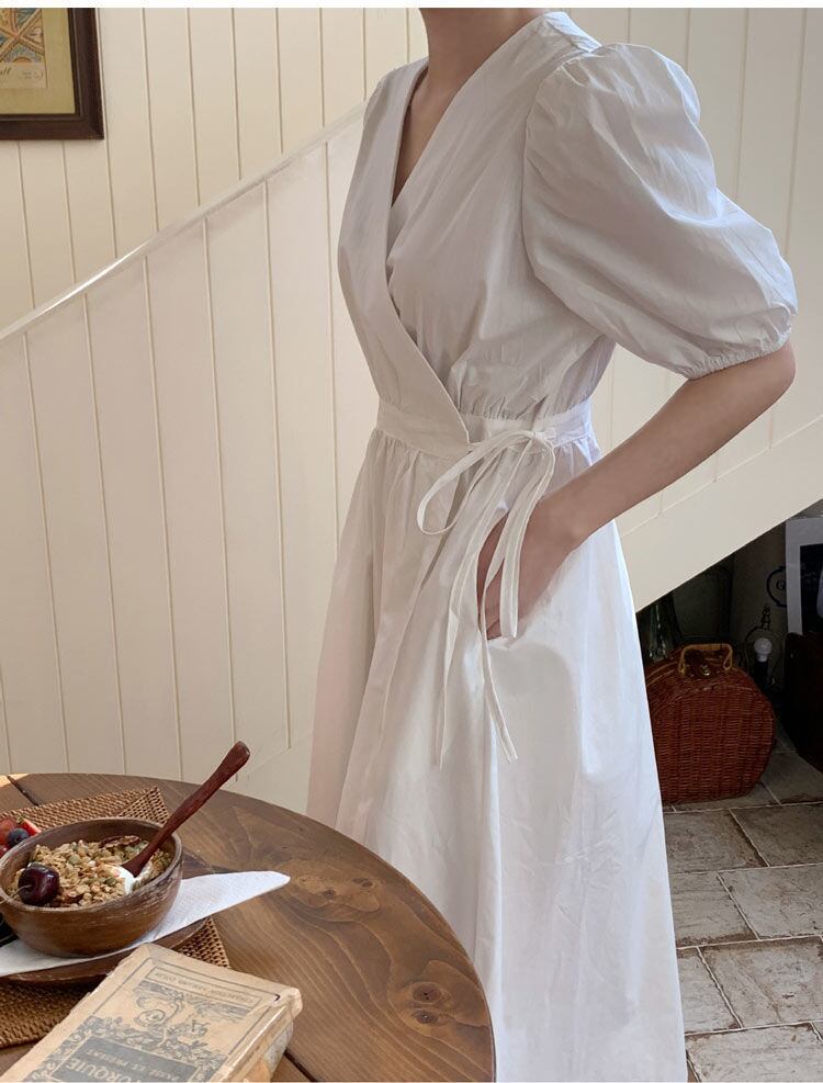 ワンピース 上着 人気 おすすめ おしゃれ お洒落 激安 安い 送料無料 プチプラ 半袖 Vネック パフスリーブ ウエスト ボリュームスリーブ Aライン 無地 ふわふわ リボン ポリエステル 可愛い かわいい 韓国 シンプル カジュアル きれいめ 大人 上品 春 スプリング サマー 夏 レディース 女性用 20代 30代 S M L XL 白 ホワイト 春カラー デート フェミニン ナチュラル