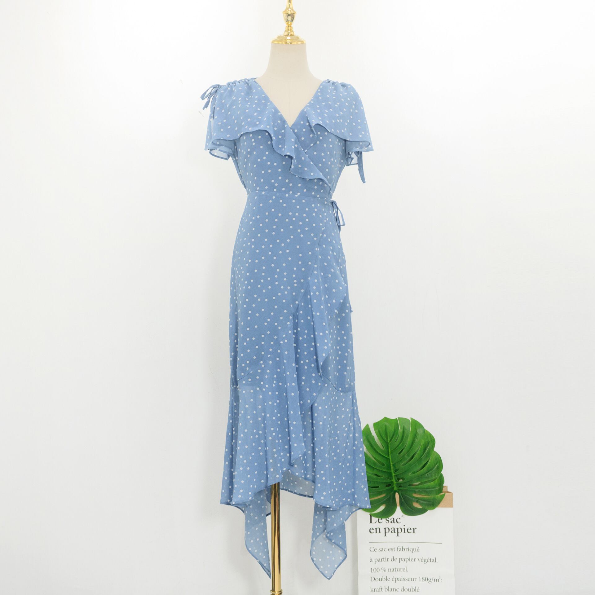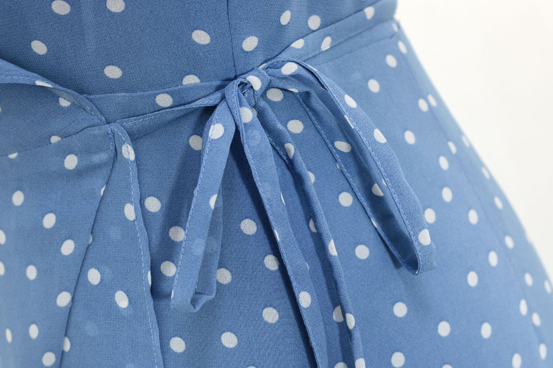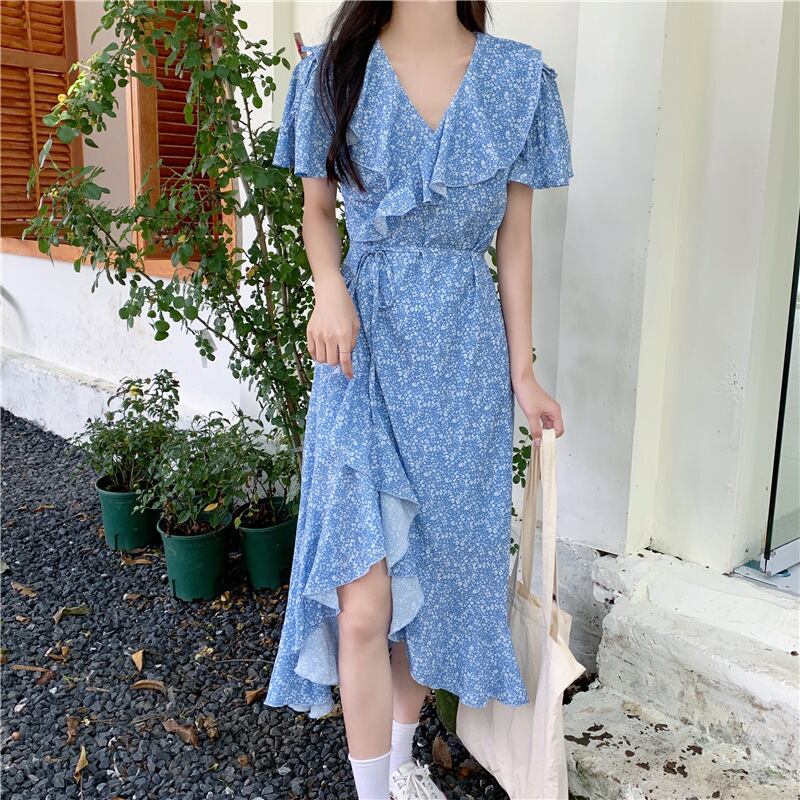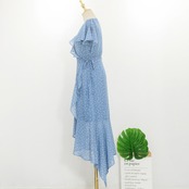 ワンピース 上着 人気 おすすめ おしゃれ お洒落 激安 安い 送料無料 プチプラ 半袖 Vネック ウエスト 柄 ふんわり ロングスカート フリル プリント ドット ポリエステル 可愛い かわいい 韓国 きれいめ カジュアル 大人 上品 春 スプリング サマー 夏 レディース 女性用 20代 30代 S M L XL 青 ブルー パステルカラー 春カラー デート フェミニン お出かけ オフィス