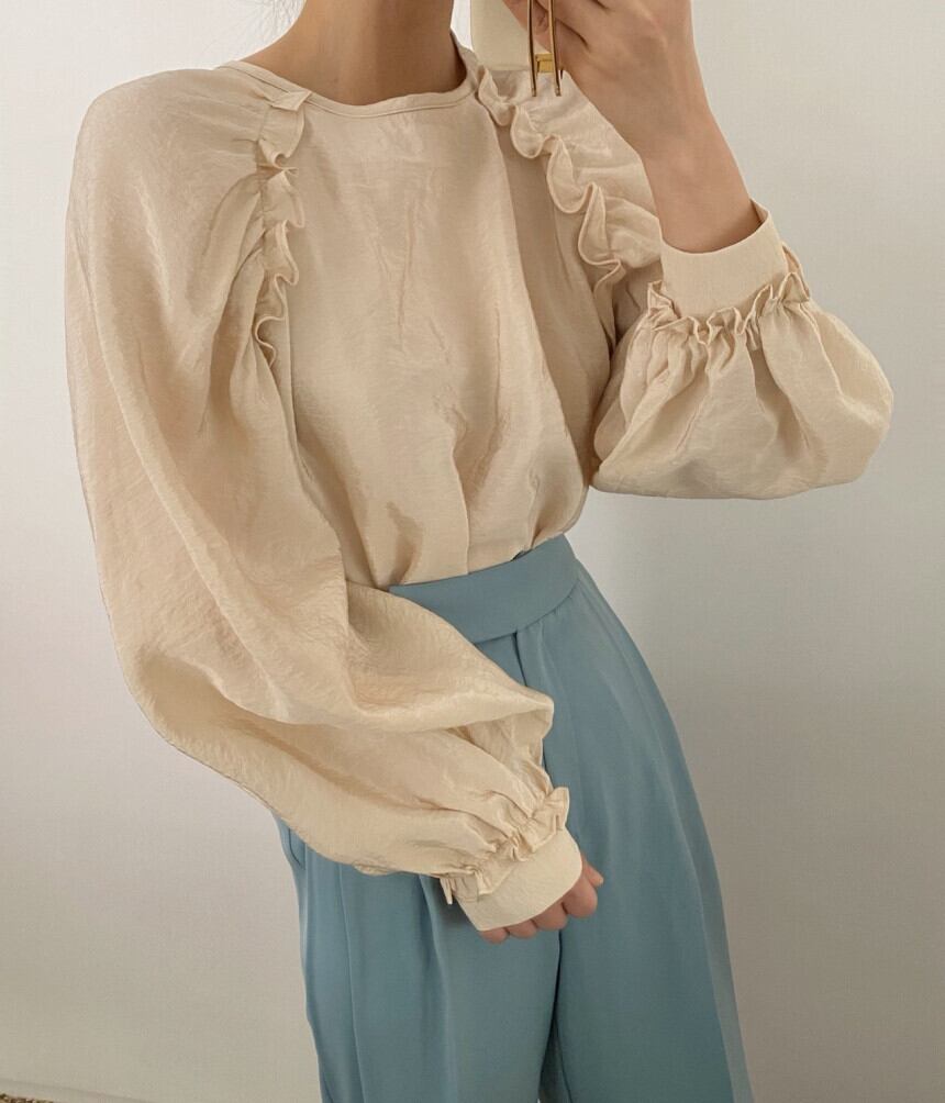 トップス レディース シャツ ブラウス 袖あり 長袖 襟なし 透け感 クルーネック パフスリーブ フリル 大人可愛い きれいめ シンプル カジュアル 大人 上品 おしゃれ お洒落 かっこいい レトロ 大人女子 こなれ感 ラフ ボーイッシュ クール モード系 セクシー エレガント モダン とろみ感 無地 春 秋 冬 入学式 入園式 卒業式 卒園式 10代 20代 30代 40代 女性用 オフィス ビジネス OL 通勤 学生 通学 デート お出かけ 休日 アプリコット