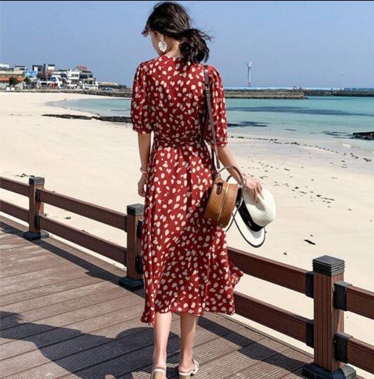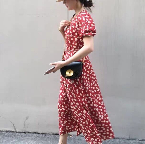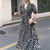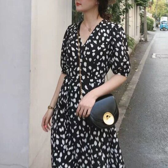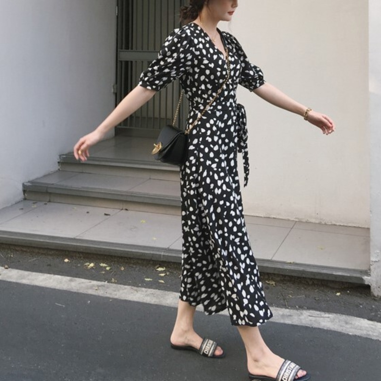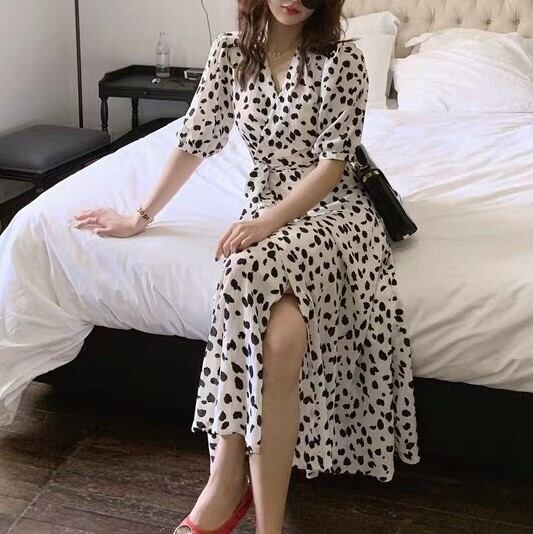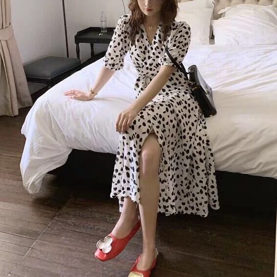 Vネック 5分袖 ワンピース ロング丈 ハイウエスト ミモレ丈 フレア カシュクール ダルメシアン フラワー かわいい 大人可愛い きれいめ シンプル カジュアル 大人 上品 おしゃれ お洒落 かっこいい 大人可愛い 大人女子 こなれ感 ラフ ラブリー キュート ガーリー ルーズ モード系 10代 20代 30代 レトロ 総柄 ゆったり マタニティ レディース 着回し 普段使い 重ね着 韓国系 オルチャン ファッション コーデ 体系カバー 流行 インスタ映え ホワイト 白 ブラック 黒 レッド 赤