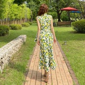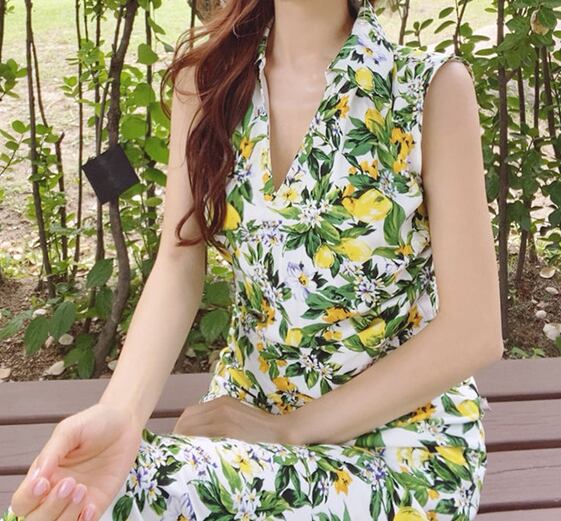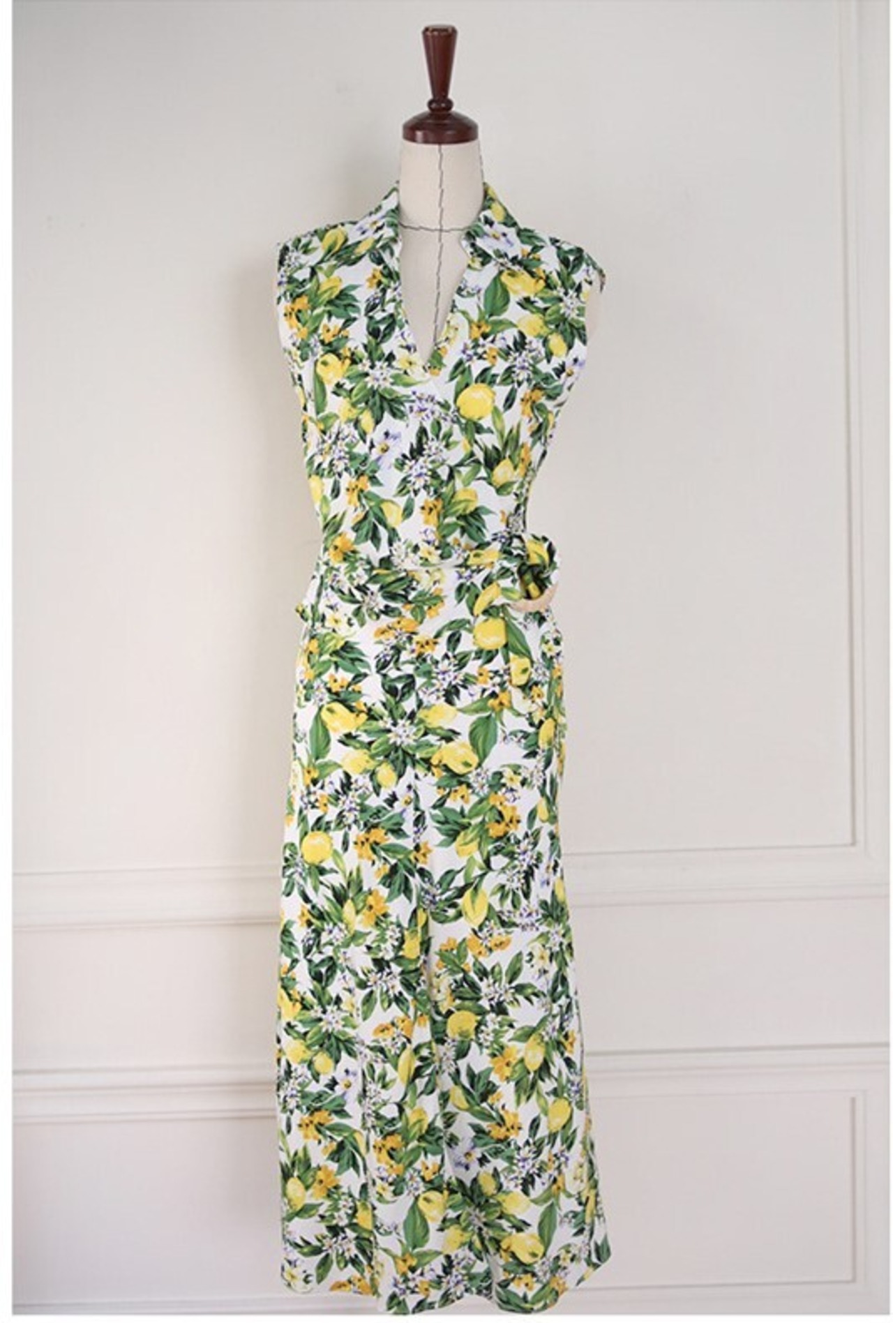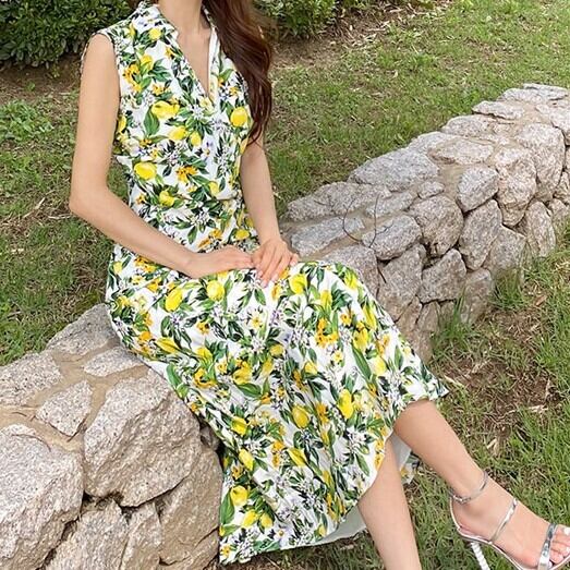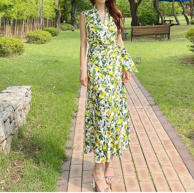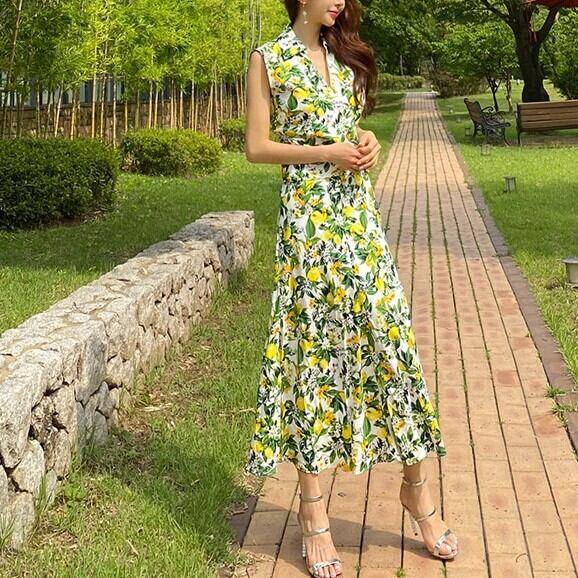 Vネック ワンピース サマードレス ハイウエスト ロング丈 フレア ミモレ丈 ノースリーブ レモン柄 フルーツ フラワー 花柄 さわやか かわいい 大人可愛い きれいめ シンプル カジュアル 大人 上品 おしゃれ お洒落 かっこいい 大人可愛い 大人女子 こなれ感 ラフ ラブリー キュート ガーリー ルーズ モード系 10代 20代 30代 海 プール リゾート レディース 着回し 普段使い 重ね着 韓国系 オルチャン ファッション コーデ 体系カバー 流行 インスタ映え