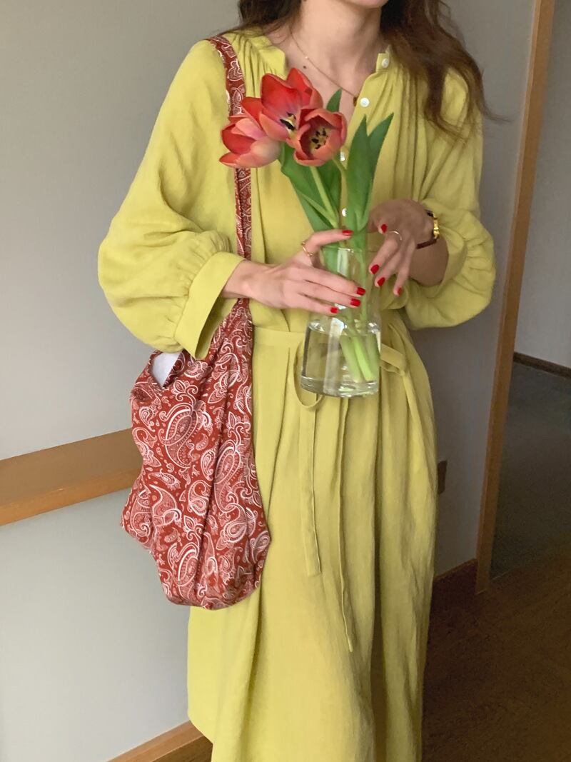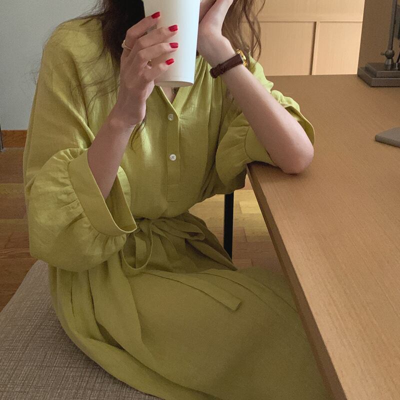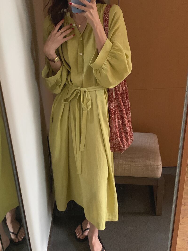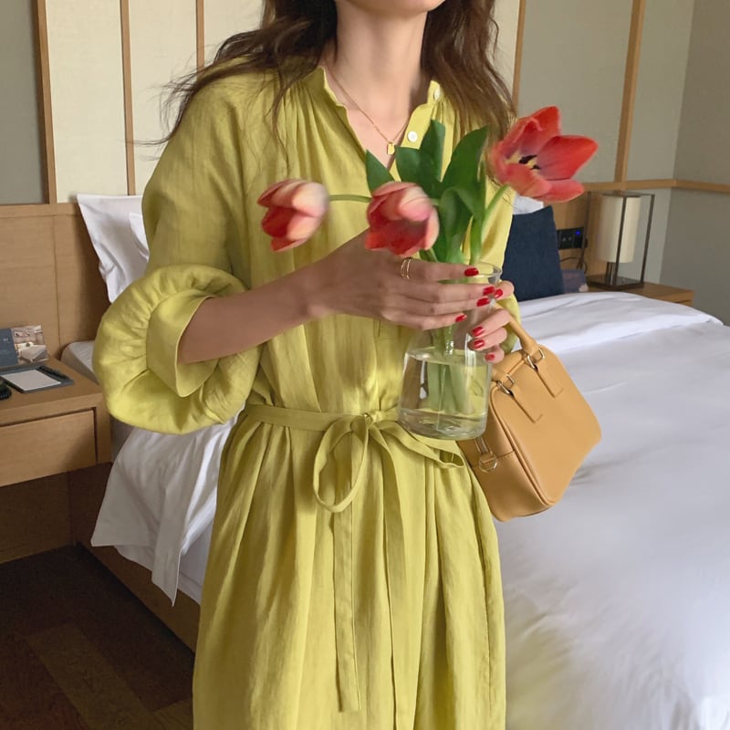 ランタンスリーブ ロング丈 ワンピース クルーネック ハイウエスト リボン ゆったり フレア くすみカラー 華奢見え かわいい 大人可愛い きれいめ シンプル カジュアル 大人 上品 おしゃれ お洒落 かっこいい 大人可愛い 大人女子 こなれ感 ラフ ラブリー キュート ガーリー ルーズ モード系 マタニティ 20代 30代 40代 レディース 着回し 普段使い 重ね着 韓国系 オルチャン ファッション コーデ 体系カバー 激安 流行 インスタ映え イエロー 黄