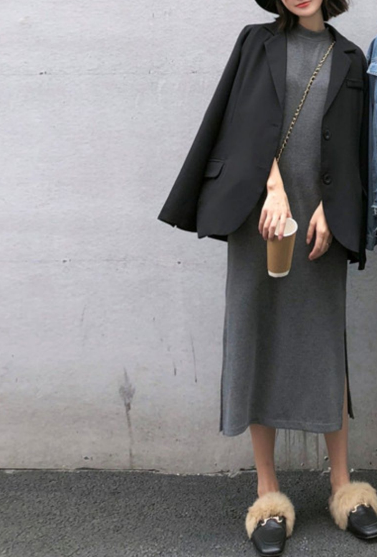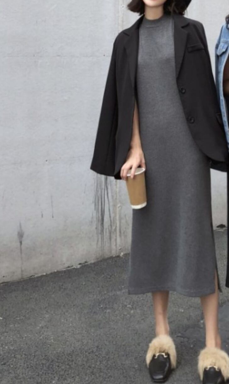シンプルでカジュアルなリブニットロングワンピース。