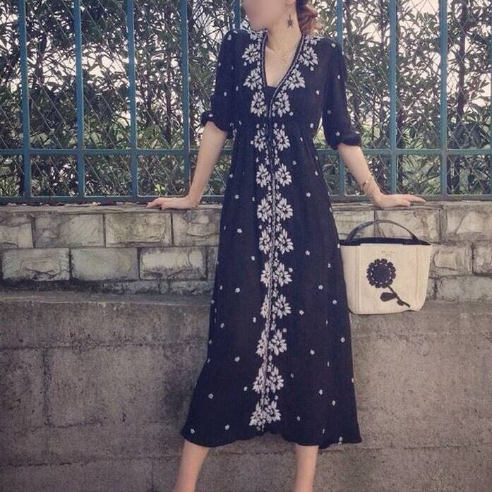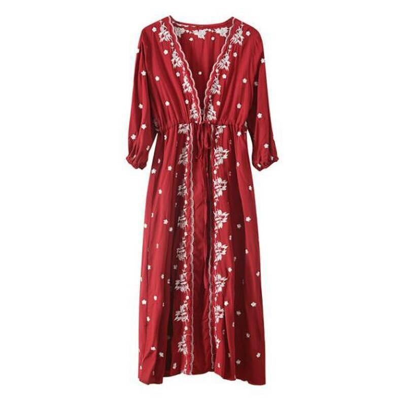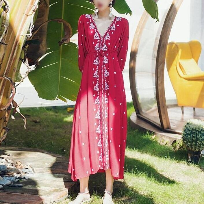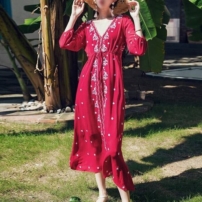 Vネック ワンピース ロング丈 ボーホー 花柄 5分袖 ウエストマーク 刺繍 エスニック ゆったり Aライン フラワー かわいい 大人可愛い きれいめ シンプル カジュアル 大人 上品 おしゃれ お洒落 かっこいい 大人可愛い 大人女子 こなれ感 ラフ ラブリー キュート ガーリー ルーズ モード系 10代 20代 30代 レトロ マタニティ レディース 着回し 普段使い 重ね着 韓国系 オルチャン ファッション コーデ 体系カバー 激安 流行 インスタ映え レッド 赤 ブルー 水色 青 ブラック 黒