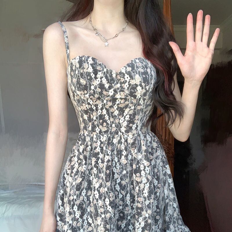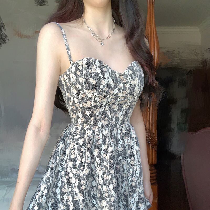 キャミトップの可愛いレトロな花柄ミニワンピース。