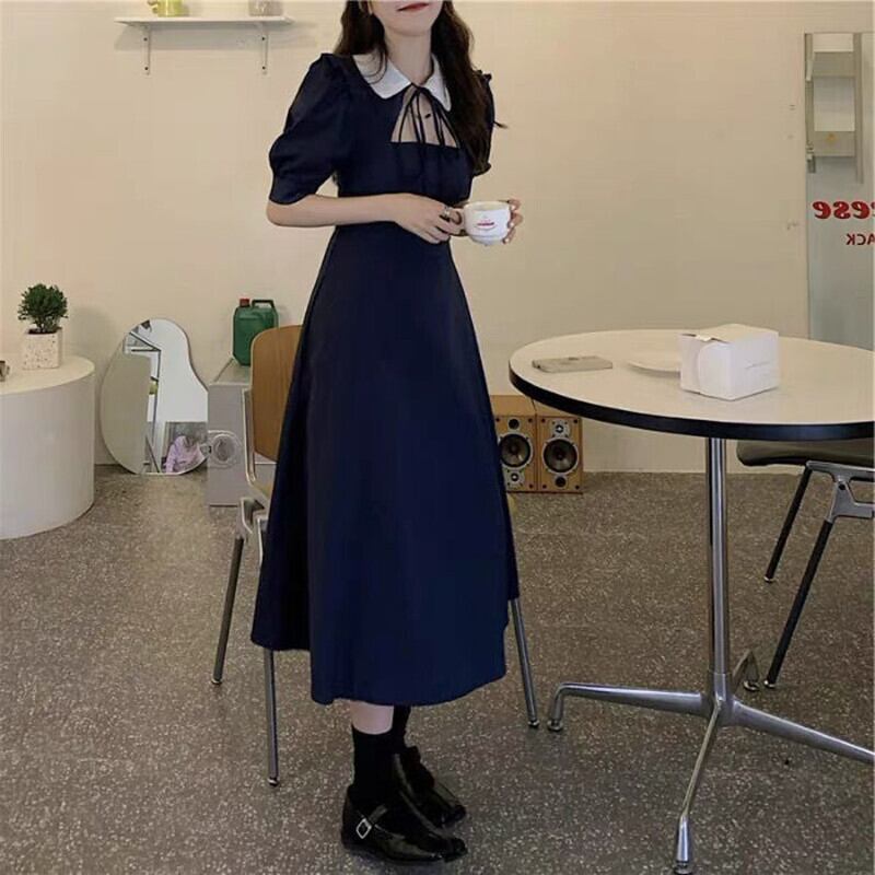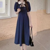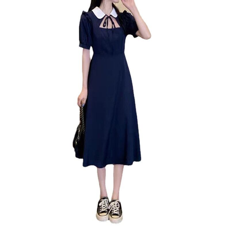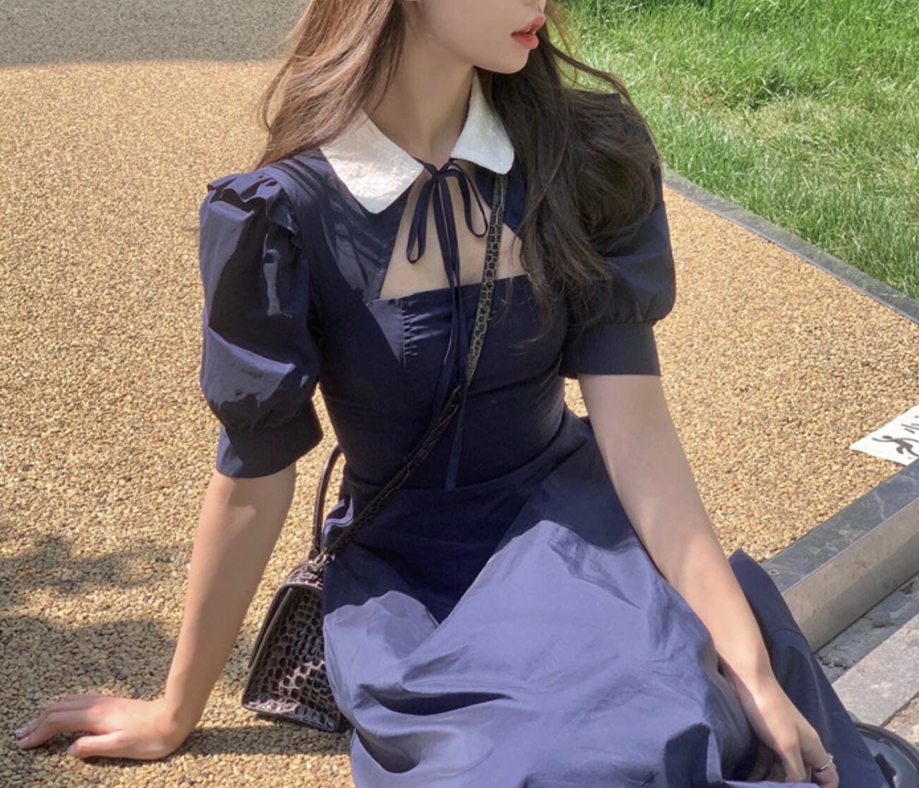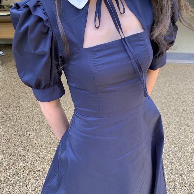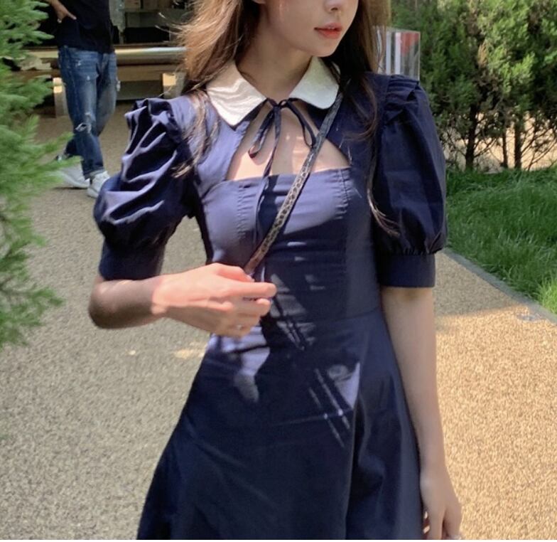 ワンピース 上着 人気 おすすめ おしゃれ お洒落 激安 安い 送料無料 プチプラ 半袖 ラウンドネック 丸首 襟 リボン Aライン パフスリーブ フレア ミニスカート ボリュームスリーブ 無地 フリル リボン ポリエステル 可愛い かわいい きれいめ 大人 上品 春 スプリング サマー 夏 レディース 女性用 20代 30代 S M L XL 紺 ネイビー 大人カラー デート フェミニン シック レトロ