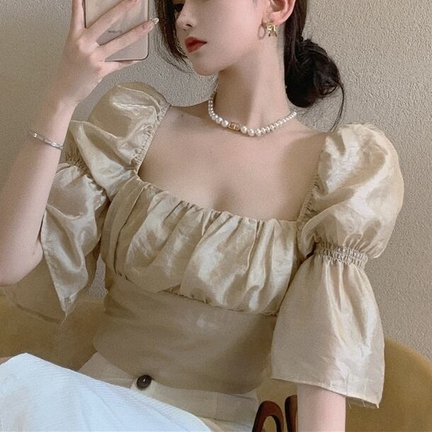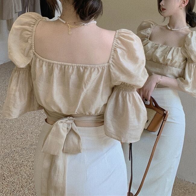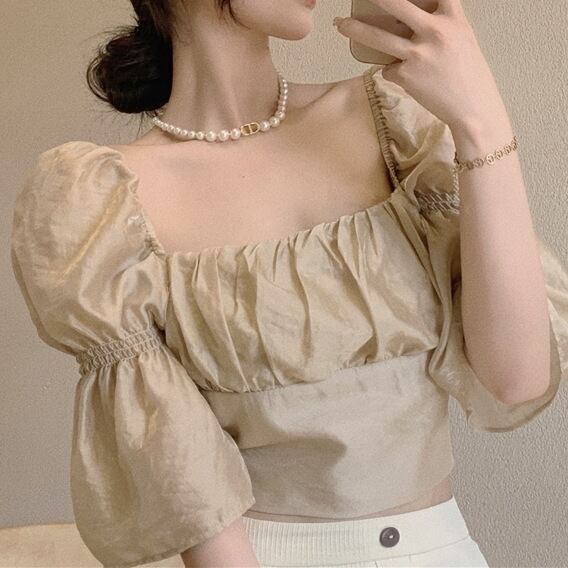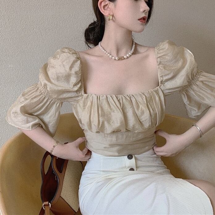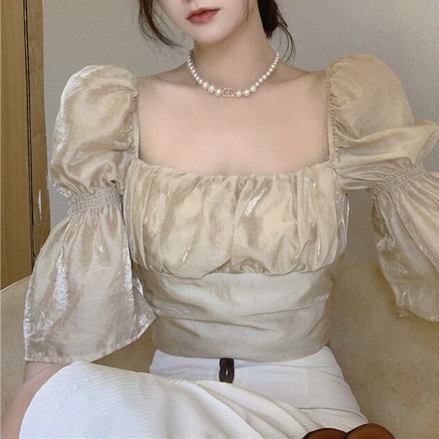 トップス ブラウス レディース 袖あり 五分袖 七分袖 スクエアネック しわ加工 ギャザー デザイン袖 ギャザー ハイウエスト クロップ丈 エレファントスリーブ タック ショート丈 ショート丈 バブルスリーブ レース かわいい 大人可愛い シンプル カジュアル 大人 おしゃれ アジアン 大人女子 こなれ感 キュート 柄 春 夏 10代 20代 30代 オフィス ビジネス OL 通勤 デート お出かけ 普段使い クラシカル レトロ ワンサイズ ブラック アプリコット