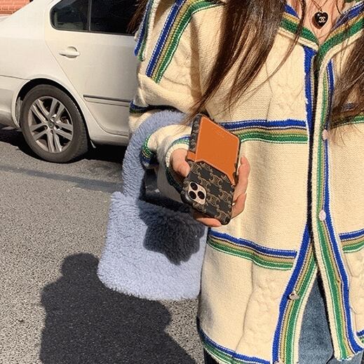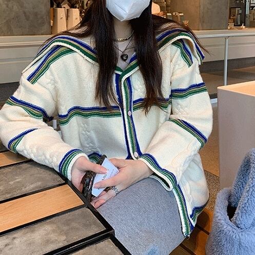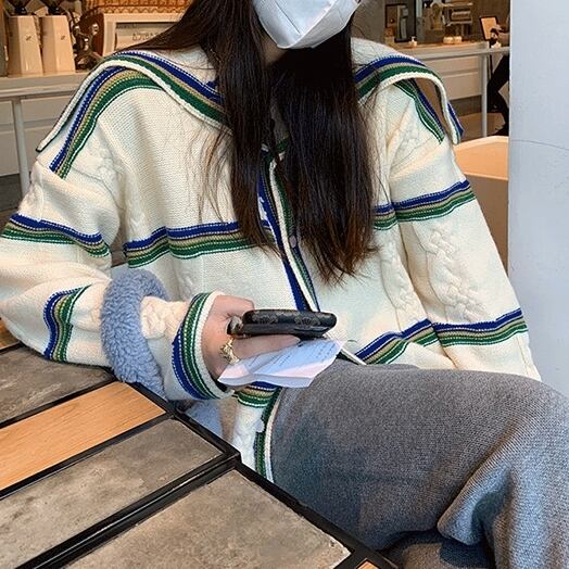 ランダムボーダーとケーブル編みが可愛いカーディガンです。