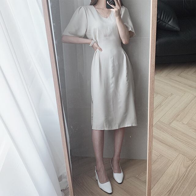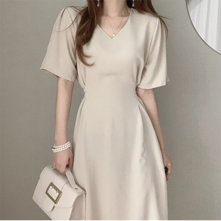 ワンピース 上着 人気 おすすめ おしゃれ お洒落 激安 安い 送料無料 プチプラ 半袖 Vネック ウエスト Aライン 無地 コットン 綿 ポリエステル 韓国 シンプル きれいめ 大人 上品 フォーマル 春 スプリング サマー 夏 結婚式 レディース 女性用 20代 30代 S M L XL ベージュ オフホワイト カーキ 大人カラー デート フェミニン パーティー